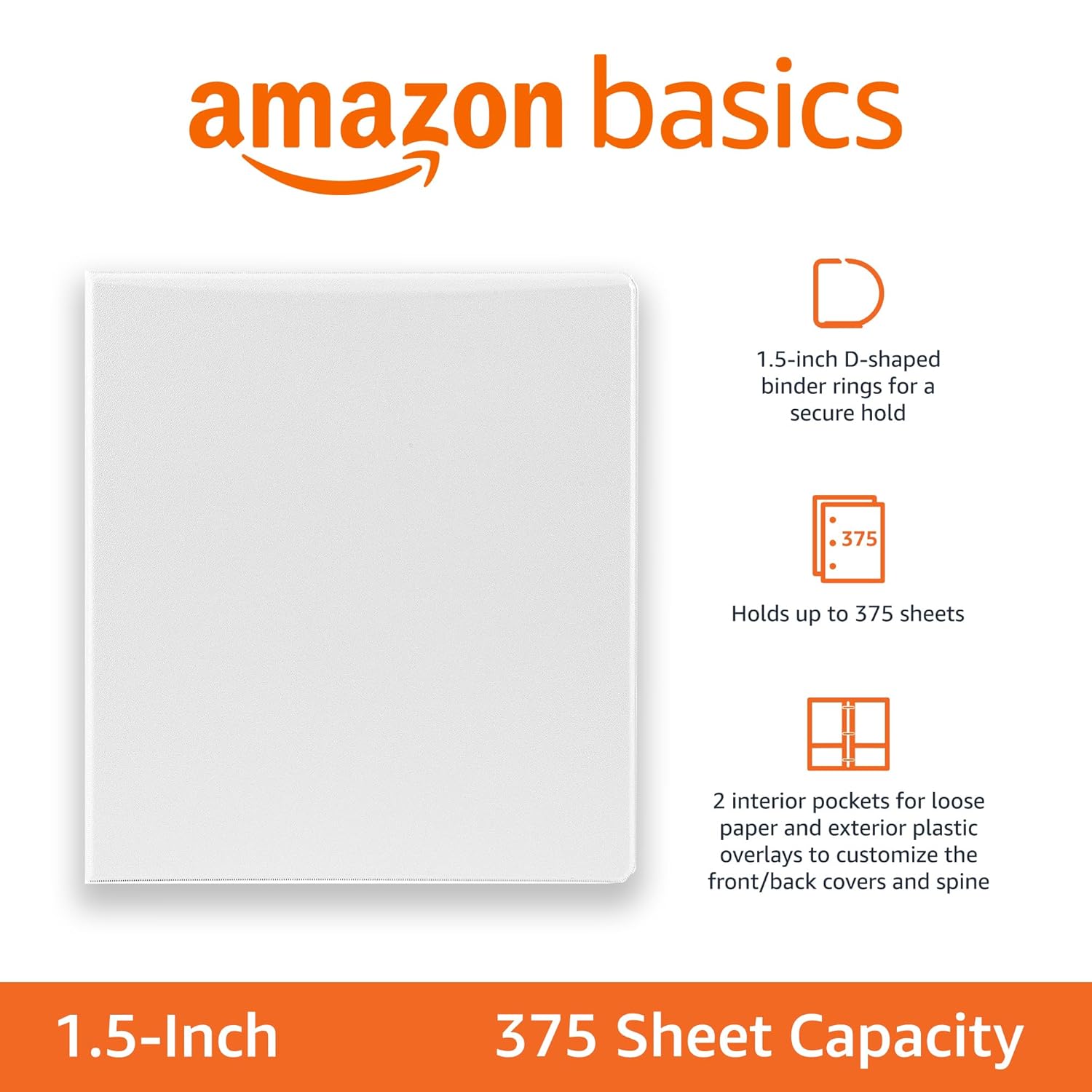 Amazon Basics 3 Ring Binders, 1.5 Inch, 4 Pack, D-Ring Organizer for School, Home Office, White