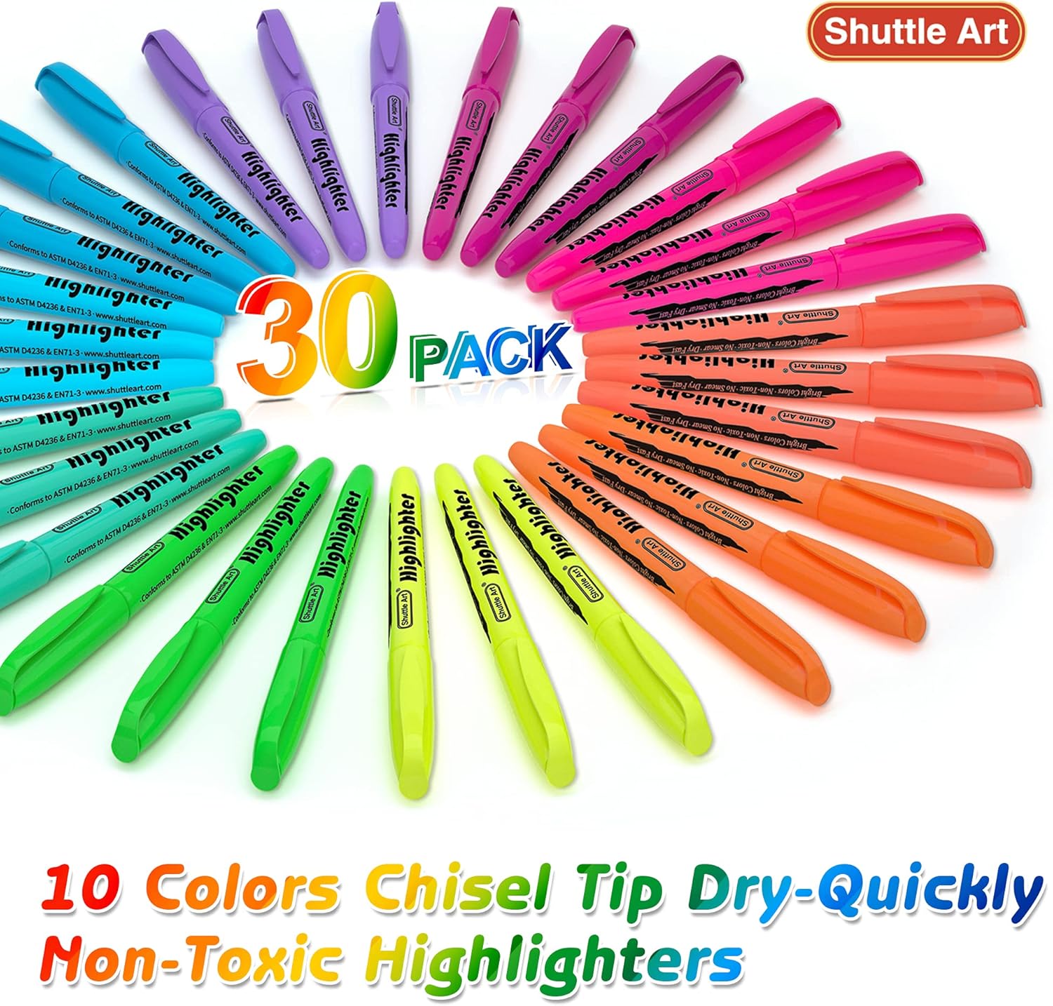 - Non-Toxic&Non Smear, Safe to use for any student, office worker and just about anyone (kids, adults etc.) Shuttle Art highlighters conform to ASTM D- 4236 & EN71.