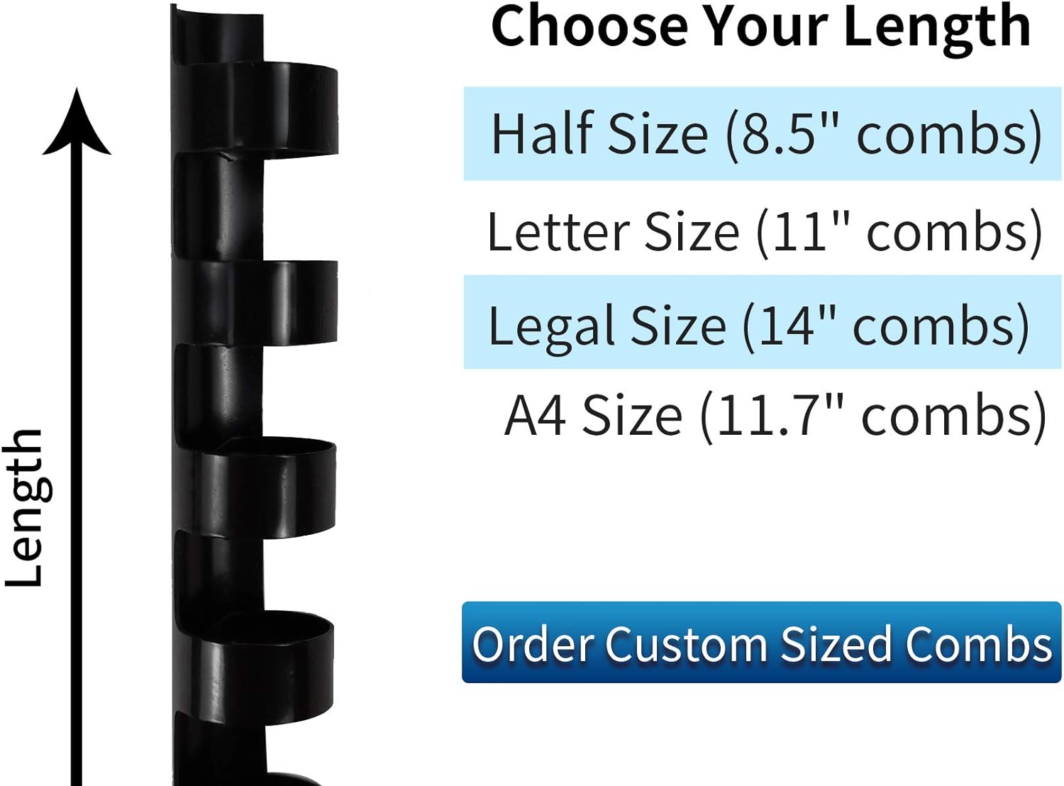 Rayson CR681012-BK Plastic Comb Binding Ring, 1/4in,5/16in,3/8in,1/2in, 19-Ring Letter Size, Black Comb Spines, Multi-Size Pack of 100