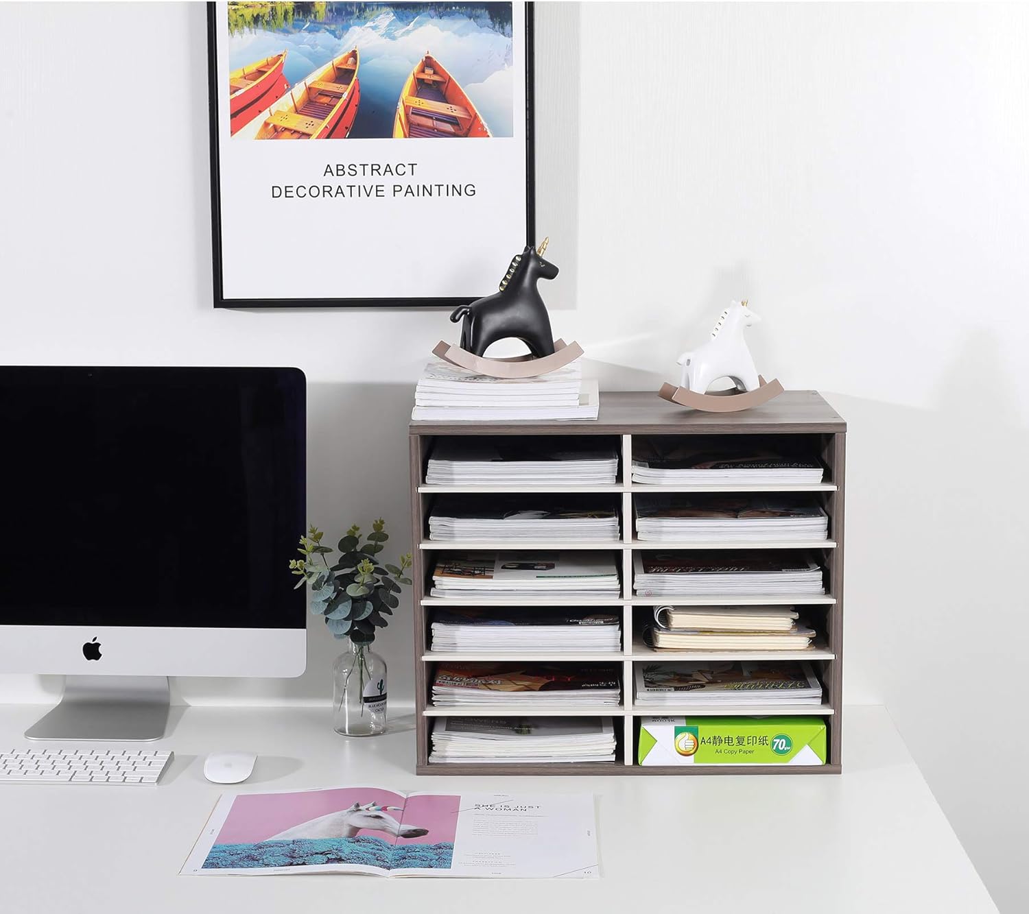 TQVAI Wood Adjustable Literature Organizer Desktop File Sorter Mail Center Paper Storage Cabinet Home & Office Mailbox School Classroom Keepers, 12 Slots Compartments, Retro Grey/White