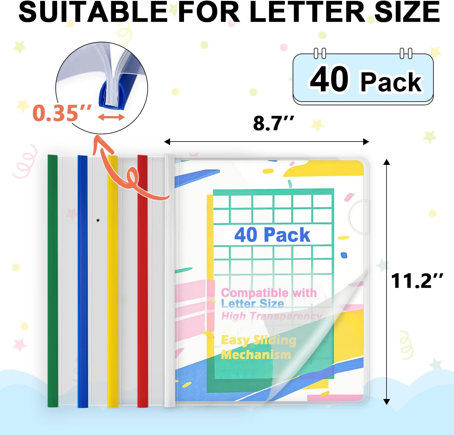 - PACKAGE INCLUDE: There are 40 pieces of clear report covers and 40 colorful sliding bars in this set, enough for you to collect and classify different documents more orderly.