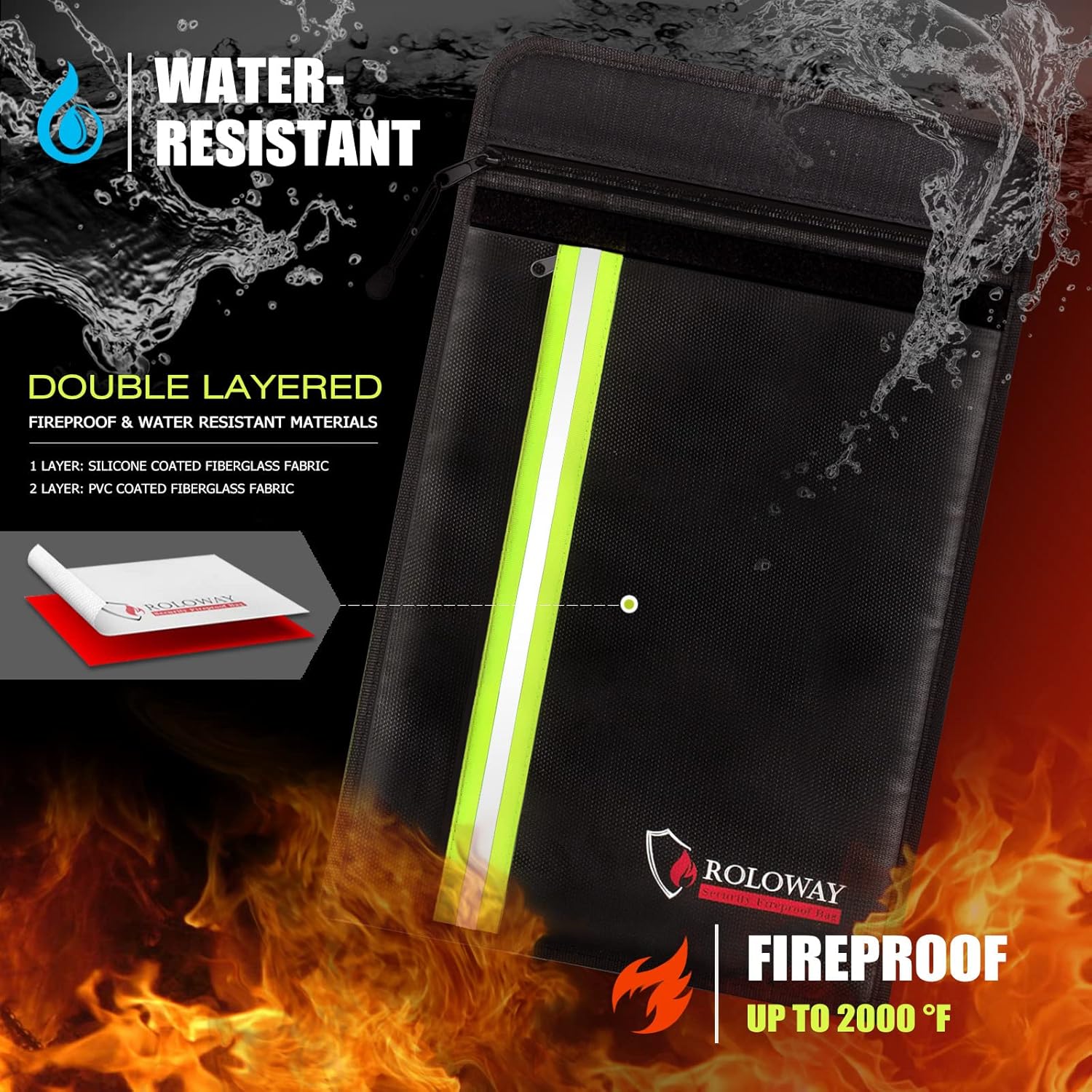 - [WATER RESISTANT & FIREPROOF BAG - PROTECTION IN All CONDITIONS]: With Dual-layer FIBERGLASS, our large Fireproof Document Bag can withstand temperature as high as 2000 F in certain time (UL94 VTM-0). Meantime, the SILICONE COATED LAYER brings great water protection to the fireproof document safe. Our fireproof money bag for cash performs reliable in ALL weather conditions. Suitable for indoors, outdoors, and EMERGENCY PREPARATION, such as rain storm, hurricane & earthquake
