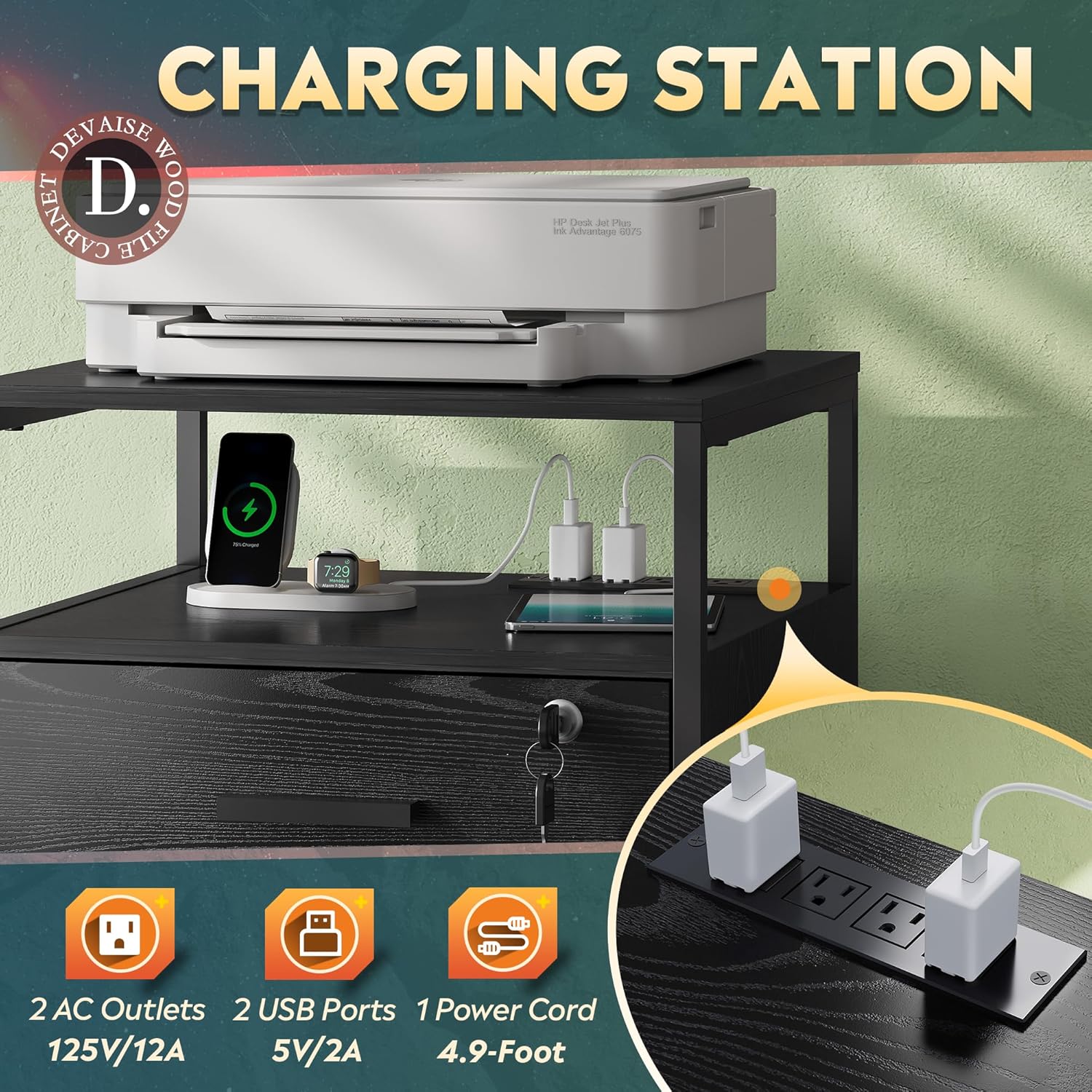 - Chargeable File Cabinet: This filing cabinet is equipped with AC power outlet and USB port, you can fix it next to or under desk, which ensure that you can charge cell phone, printer and other devices while you are working, and also enhance the convenience in home office.