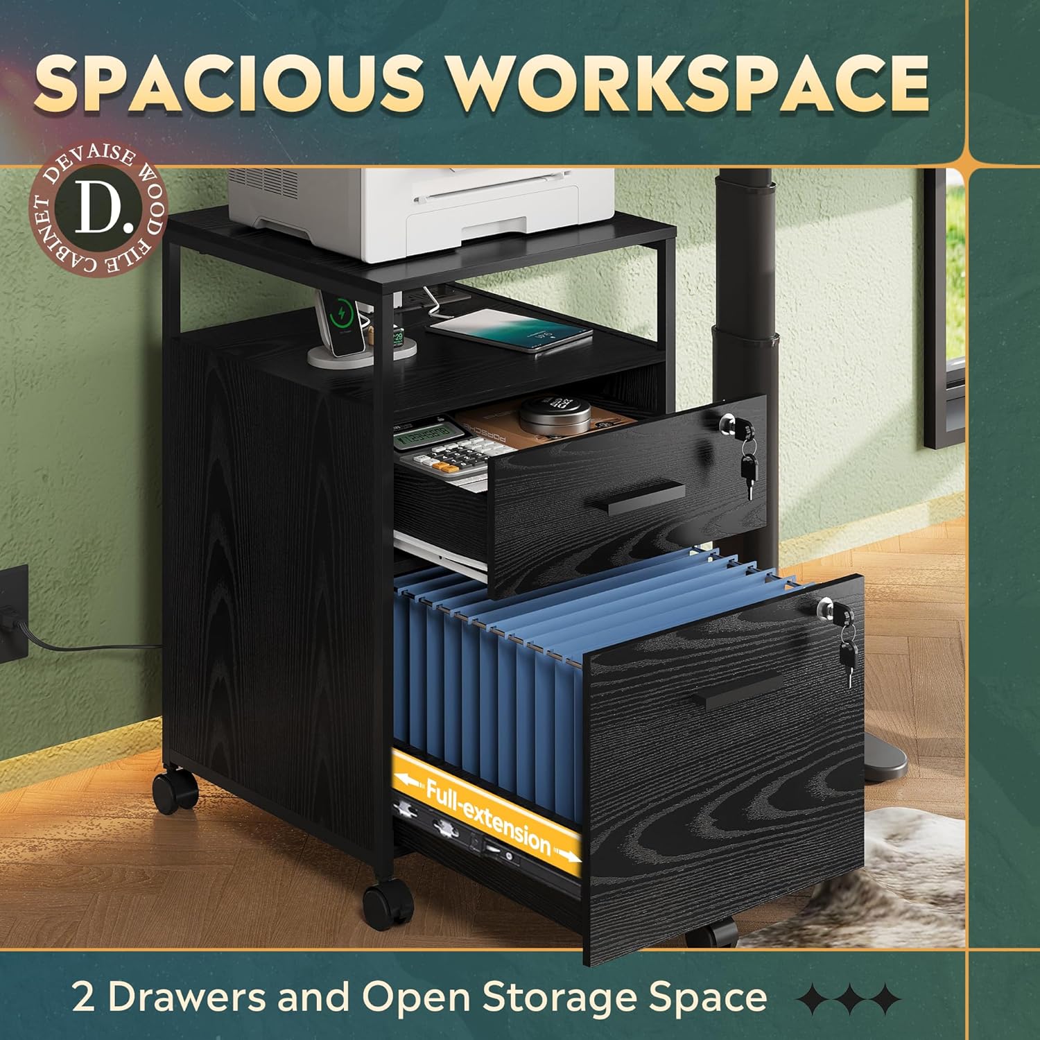 DEVAISE 2 Drawer File Cabinet with Lock and Charging Station, Wood Filing Cabinet fits A4 or Letter Size, Mobile Printer Stand with Open Storage Shelf for Home Office, Black