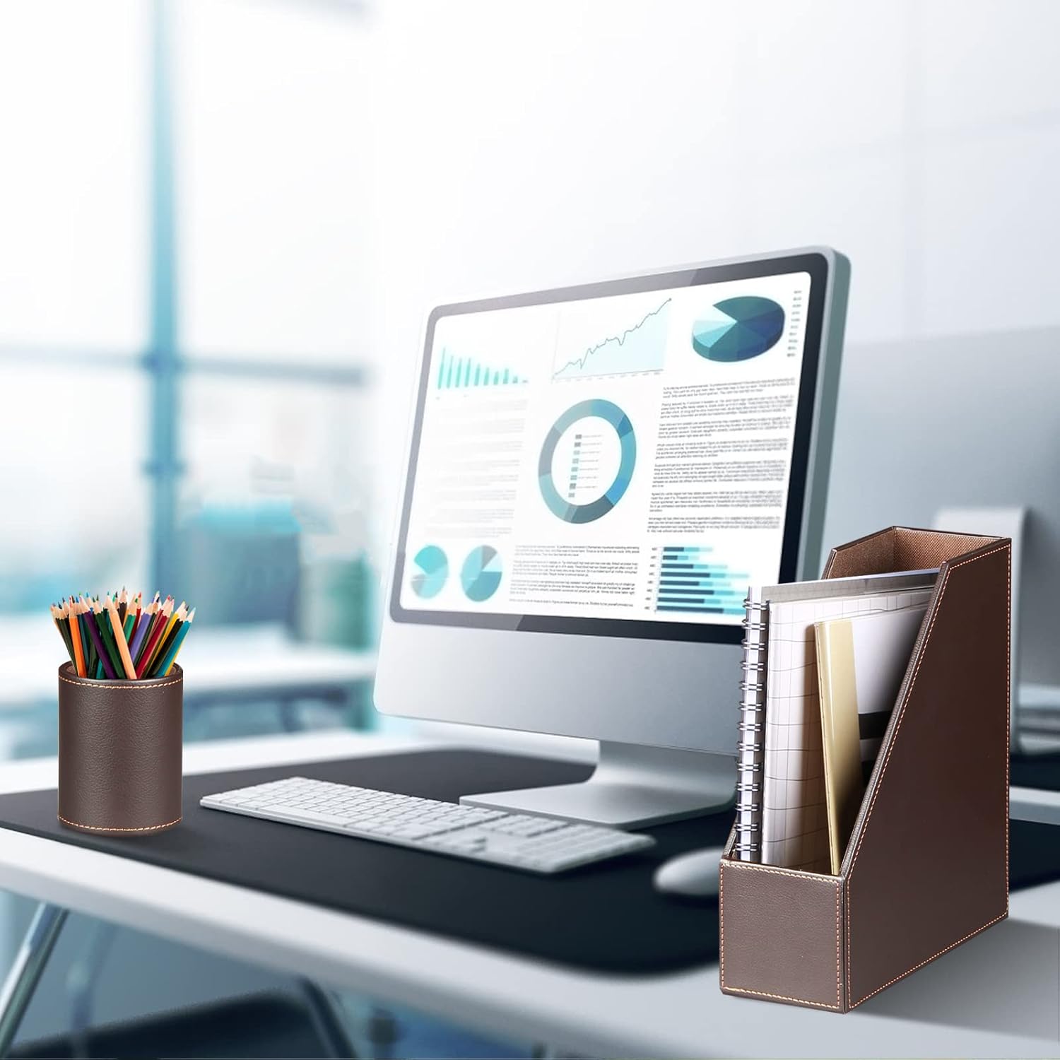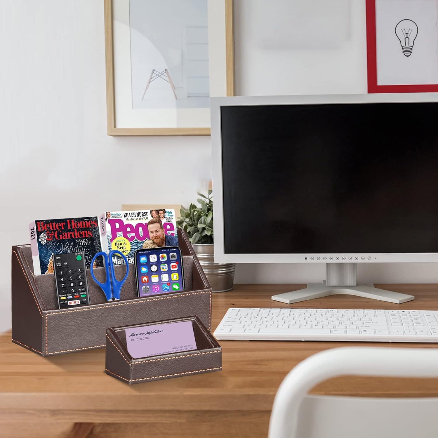 Ayunga PU Leather 6-piece Office Supplies Combination Set,Pencil Cup,Business Card Holder,Sticky Note Dispenser,Mail Sorter,Letter Tray,Files Holder,Suitable for Self-use and Friend Gifts (Brown)