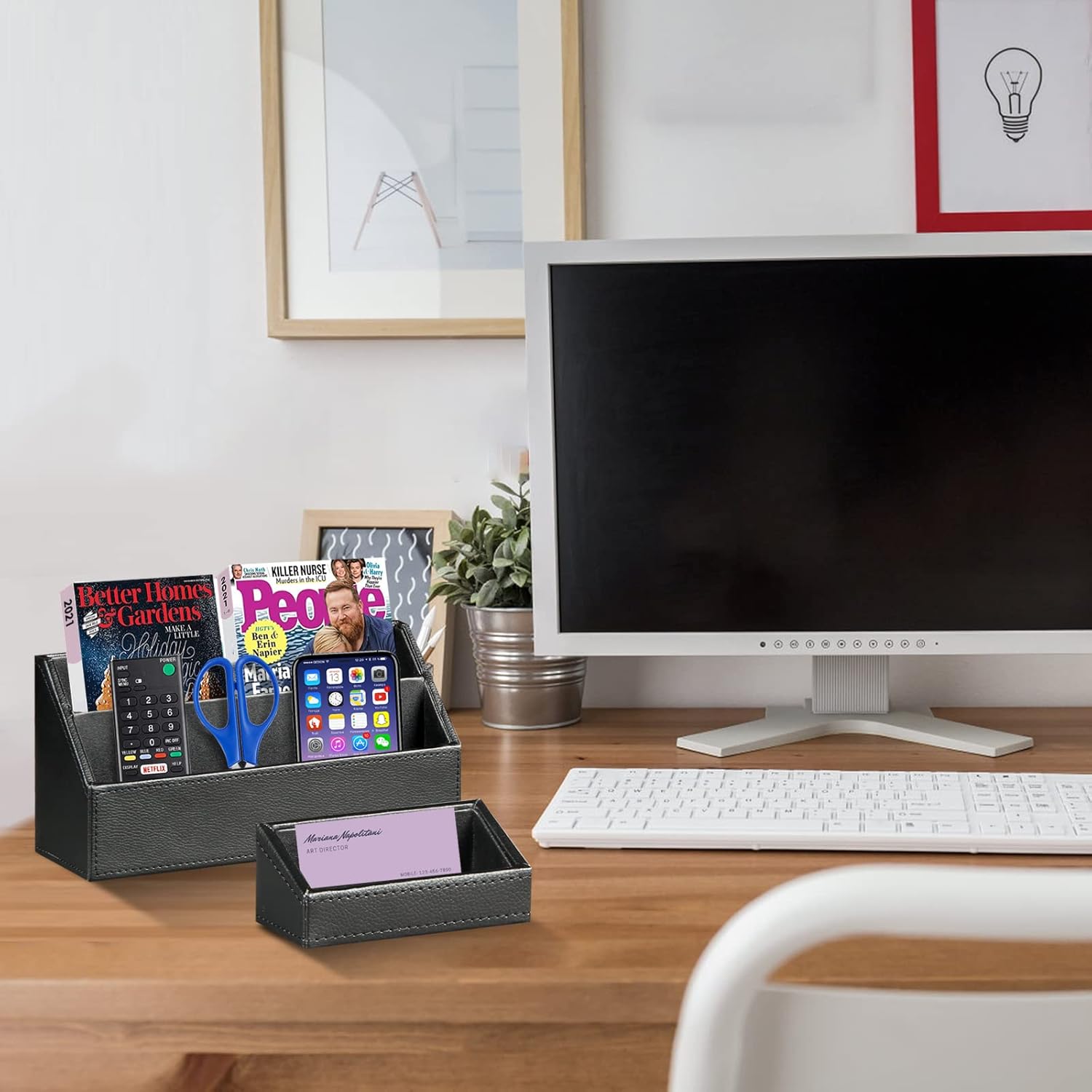 - / VERSATILE AND CUTE: Magazine holder can organize your files folder/ books/ letter size papers; Letter tray can storage A4 papers, notebooks, binders and documents. Mail sorter with 3 dividers for letters, stationary, invoices, etc; Pencil holder cup can storage pens/ markers/ scissors/ art supplies ; Sticky note holder stand can keeps notepads/ memos/ quick notes; Business card holder can keep name cards in place;