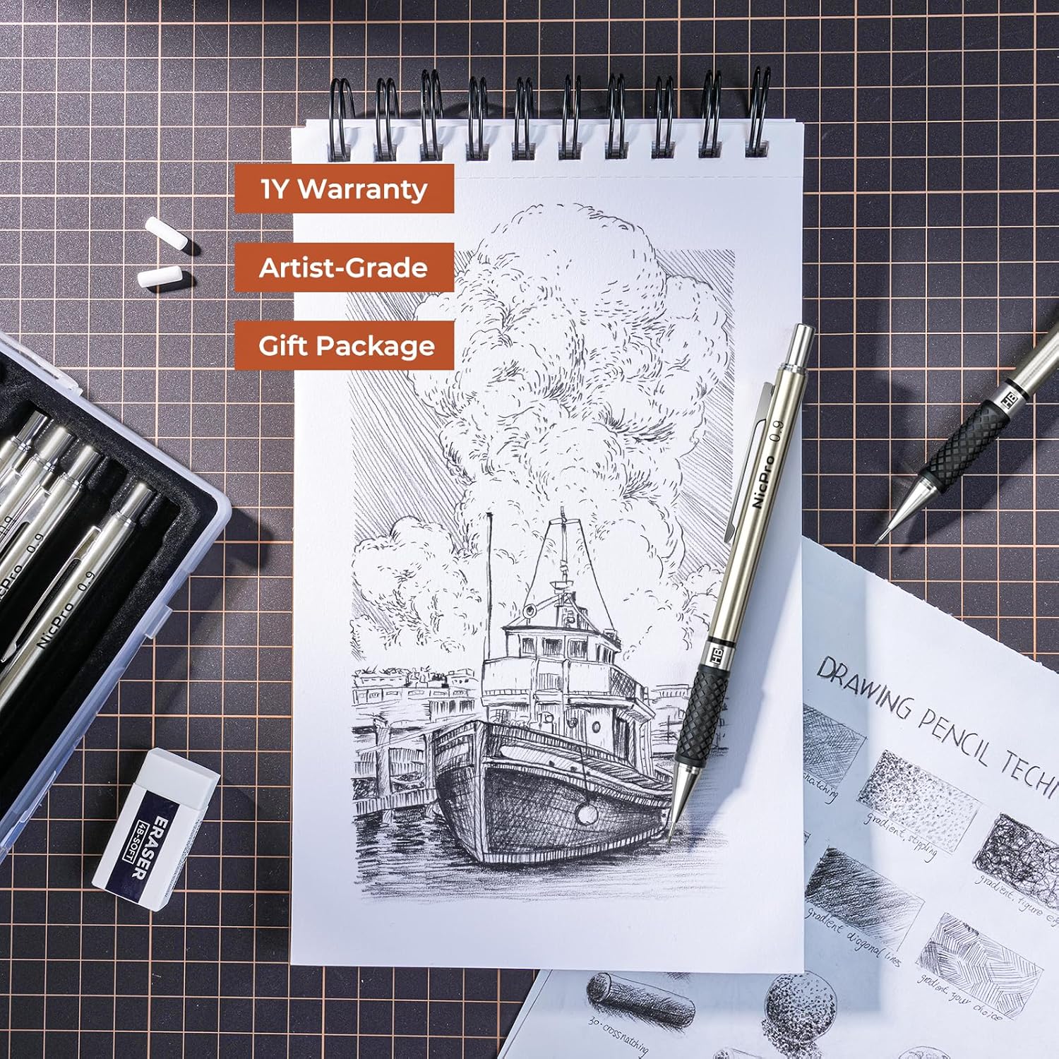 Nicpro 0.9 mm Art Mechanical Pencils Set in Gift Case, 6 PCS Metal Drafting Pencil 0.9mm with 6 Tube HB Lead Refills & 18 PCS Eraser Refills for Adults, Children, Artist Writing, Drawing, Sketching