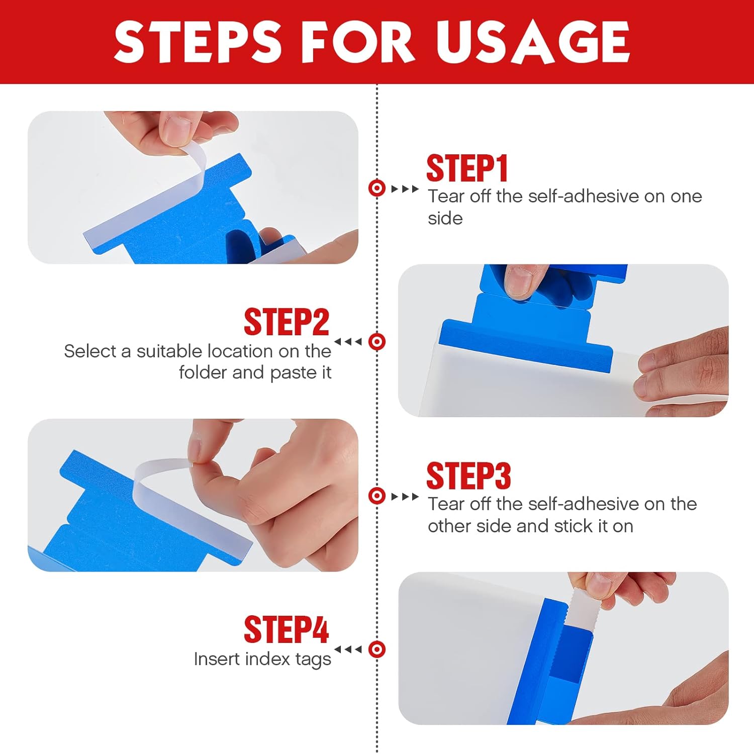 - Self Adhesive Tabs: these adhesive tabs are made of quality adhesive that will stay on your folders for a long time, not easy to move or slip off, and you can stick them on pages as you want, making your work more efficient