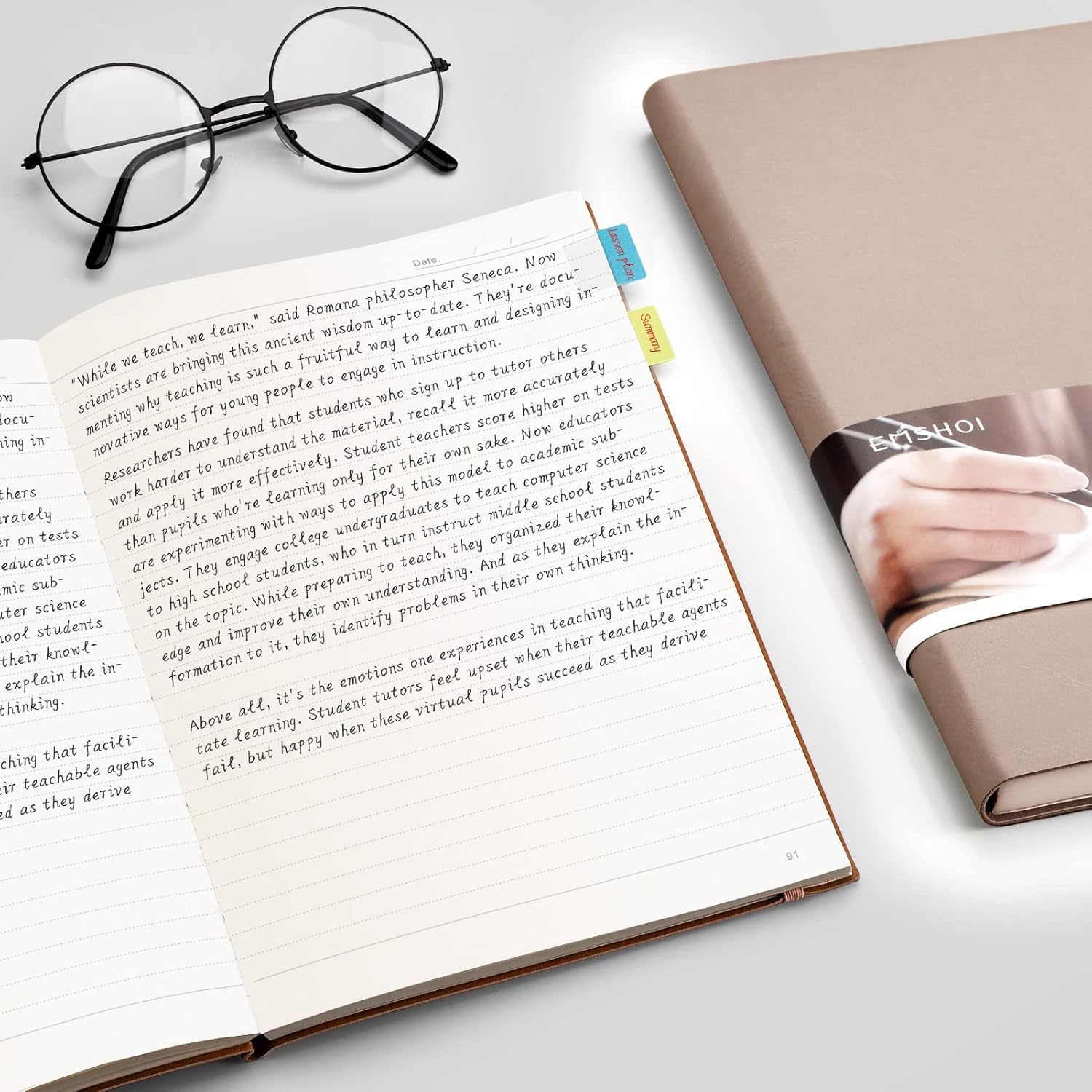 - Journal Design: Numbered pages, index pages, an elastic closure, sticky notes, 2 ribbon bookmarks, and a back pocket. Ideal for organizing and protecting important pages and items