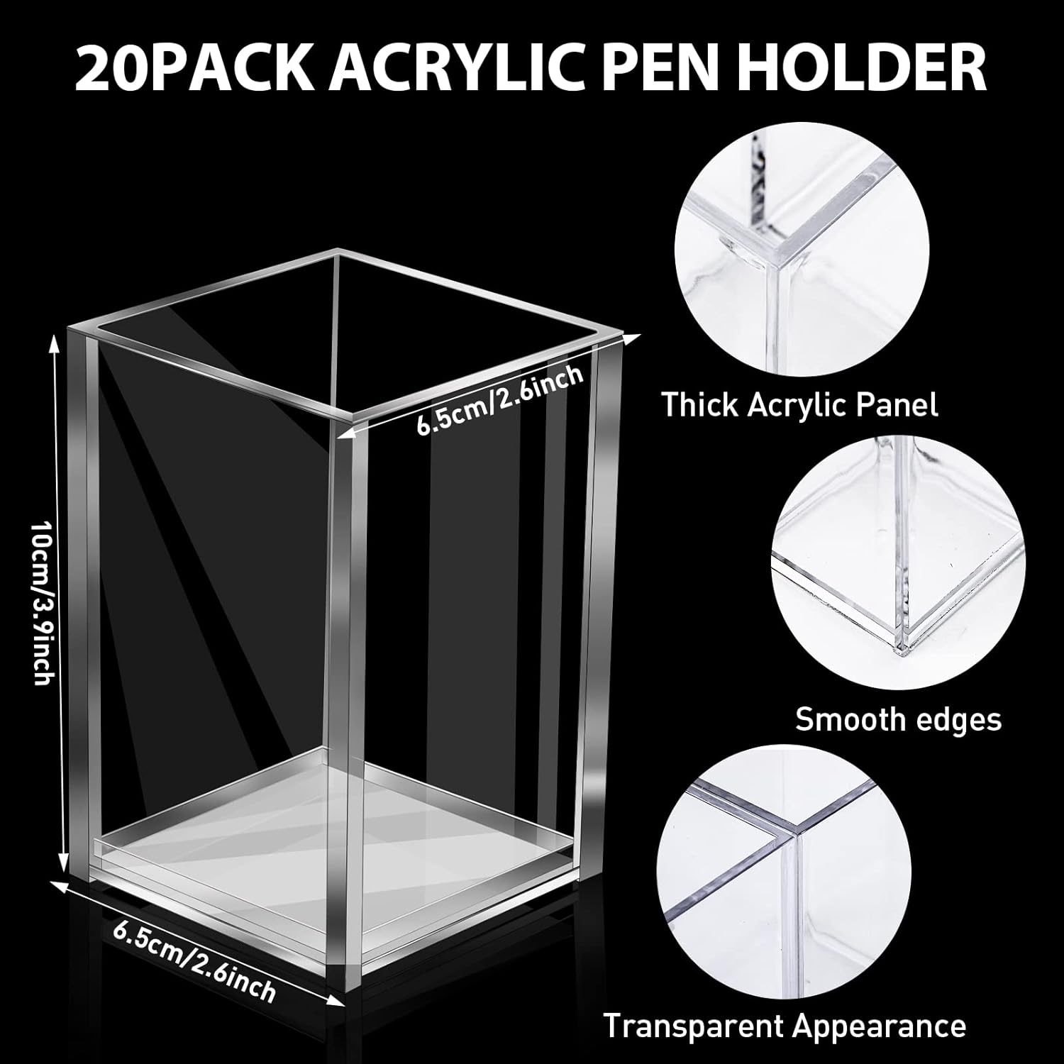- ă20 Pack Pencil HoldersăYou will receive 20 pieces clear acrylic pen holders, the acrylic pen holder measures 6.5 x 6.5 x 10 cm/ 2.6 x 2.6 x 3.9 inches, Sufficient quantity and suitable size can meet your daily storage, and can keep our desktop clean and neat