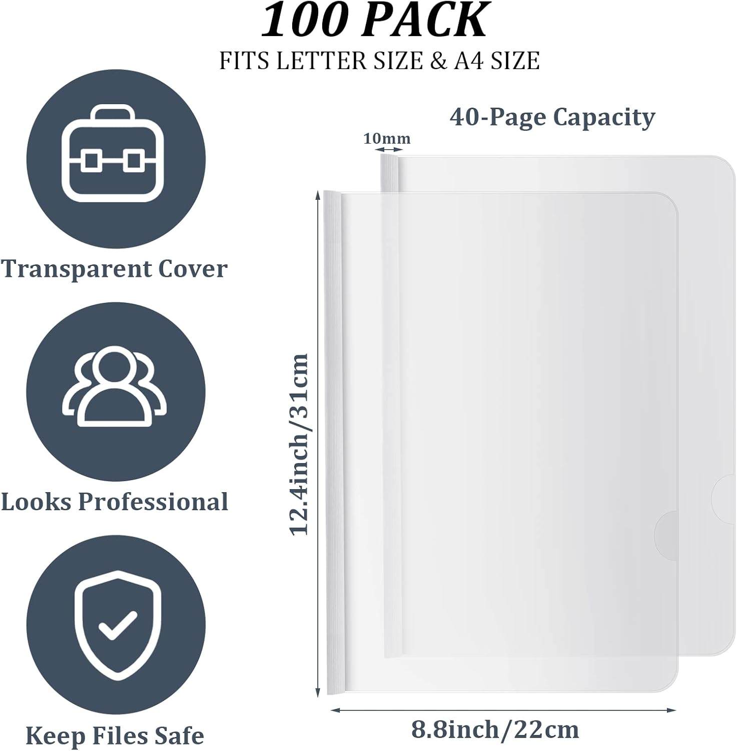 - Package Includes: a set of 100 clear report covers with sliding bar; These folders are the ideal choice for organizing and presenting your work resume, school projects, presentations, documents, proposals, and portfolios; They help keep your documents organized and protect them from spills and stains
