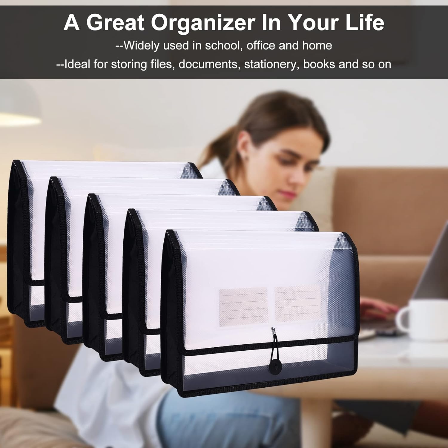 Eco-Friendly Plastic File Folders, Poly Expanding File Wallet, Expandable Envelope Organizer Document Folder with Elastic Band and Button Closure, with Small Two Pockets, 5 Pack- Black