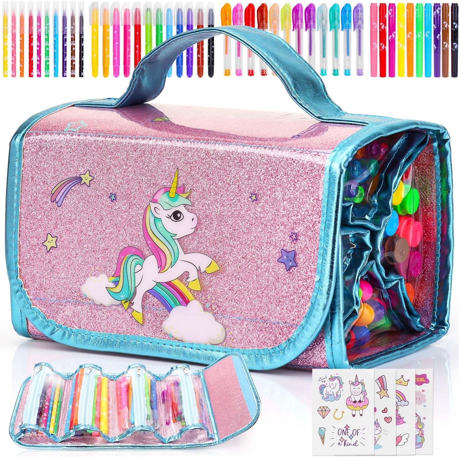 - Unicorn Scented Markers Set: Contains 44 scented markers including jumbo, fine, twistable, and mini glitter gel pens with unicorn themes