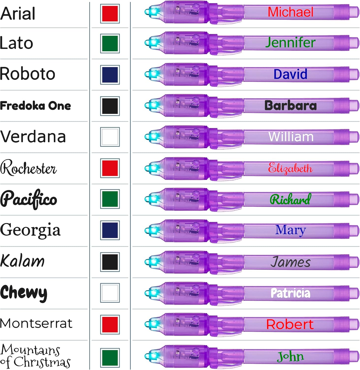 - GREAT GIFT FOR FUN PARTY FAVORS: These Personalized Invisible Spy Pens come in a pack of 24 Purple Pens to make the activity more exciting and fun.The color of the light is blue and it will display the words written in clear ink for all pens. Batteries are included and installed. Parents can buy these Spy Pens for their kid’s party at home. Schools, Teachers can buy it for students for a school Activity. Add it for any surprise gift bag or as Stock Stuffers.