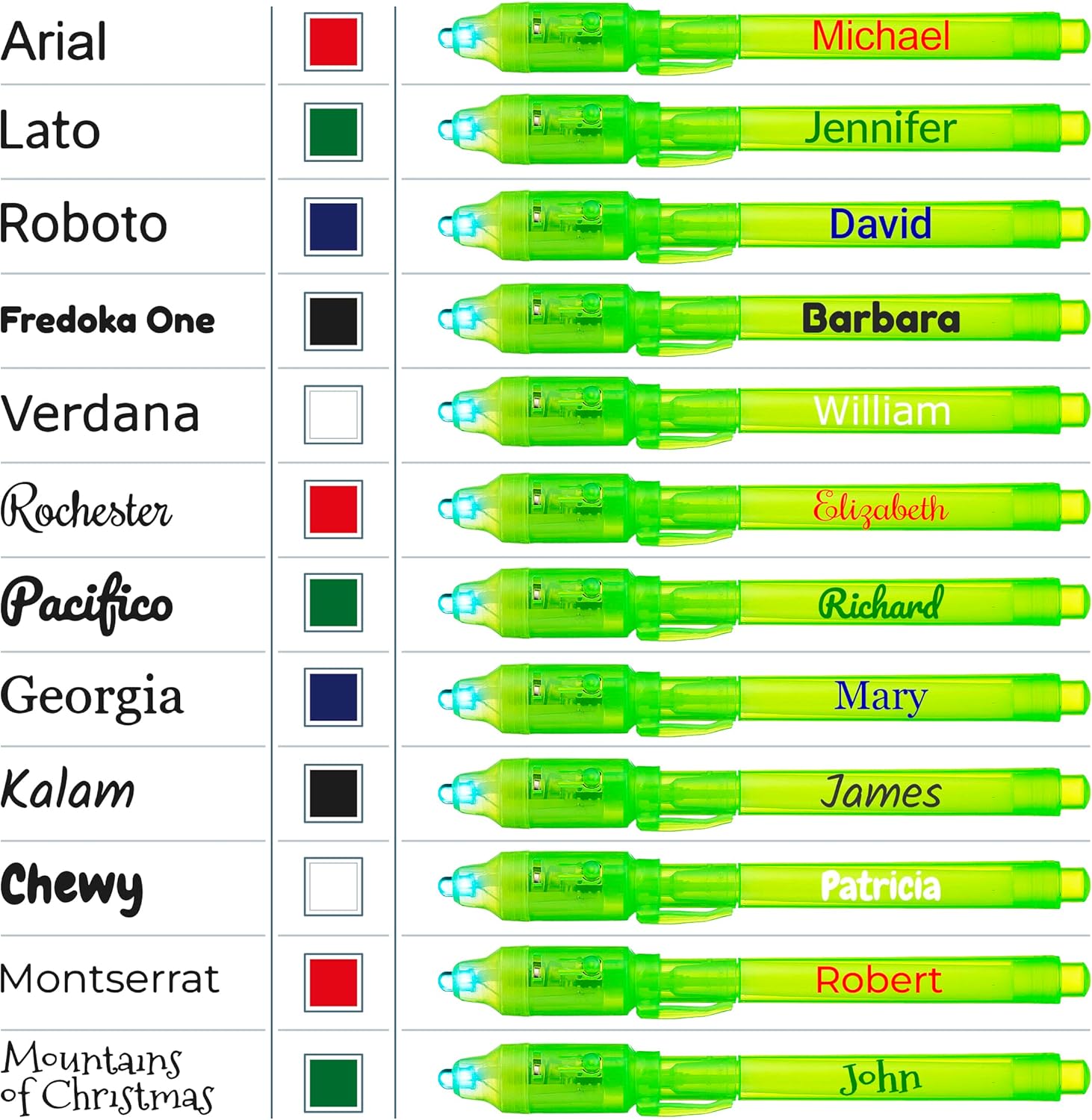- GREAT GIFT FOR FUN PARTY FAVORS: These Personalized Invisible Spy Pens come in a pack of 12 Green Pens to make the activity more exciting and fun.The color of the light is blue and it will display the words written in clear ink for all pens. Batteries are included and installed. Parents can buy these Spy Pens for their kid’s party at home. Schools, Teachers can buy it for students for a school Activity. Add it for any surprise gift bag or as Stock Stuffers.