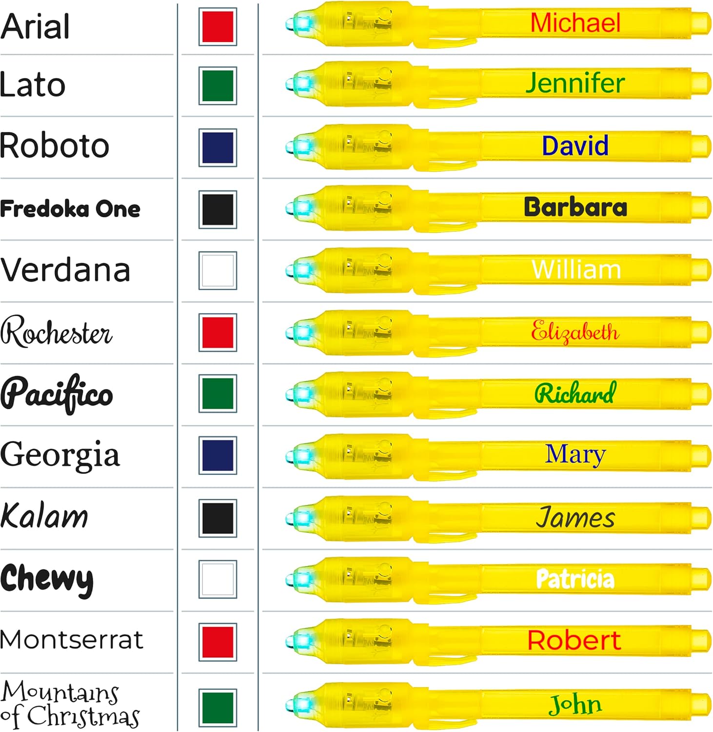 - GREAT GIFT FOR FUN PARTY FAVORS: These Personalized Invisible Spy Pens come in a pack of 12 Yellow Pens to make the activity more exciting and fun.The color of the light is blue and it will display the words written in clear ink for all pens. Batteries are included and installed. Parents can buy these Spy Pens for their kid’s party at home. Schools, Teachers can buy it for students for a school Activity. Add it for any surprise gift bag or as Stock Stuffers.