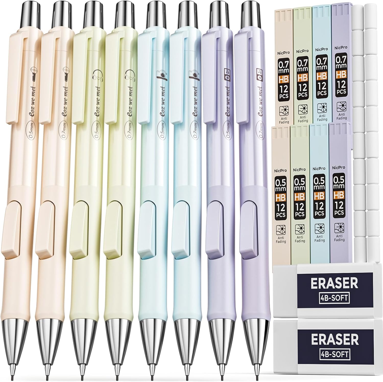 - 【Valued Mechanical Pencil Set 20PCS】: The exquisite mechanical pencil set come with 8pcs mechanical pencils in line size 0.5 mm & 0.7 mm (Purple / Green / Nude / Blue), 8 tubes of 0.5mm + 0.7mm lead refills (total 96 pcs), 2 pcs eraser, 20 pcs replaceable eraser refills, a plastic case.