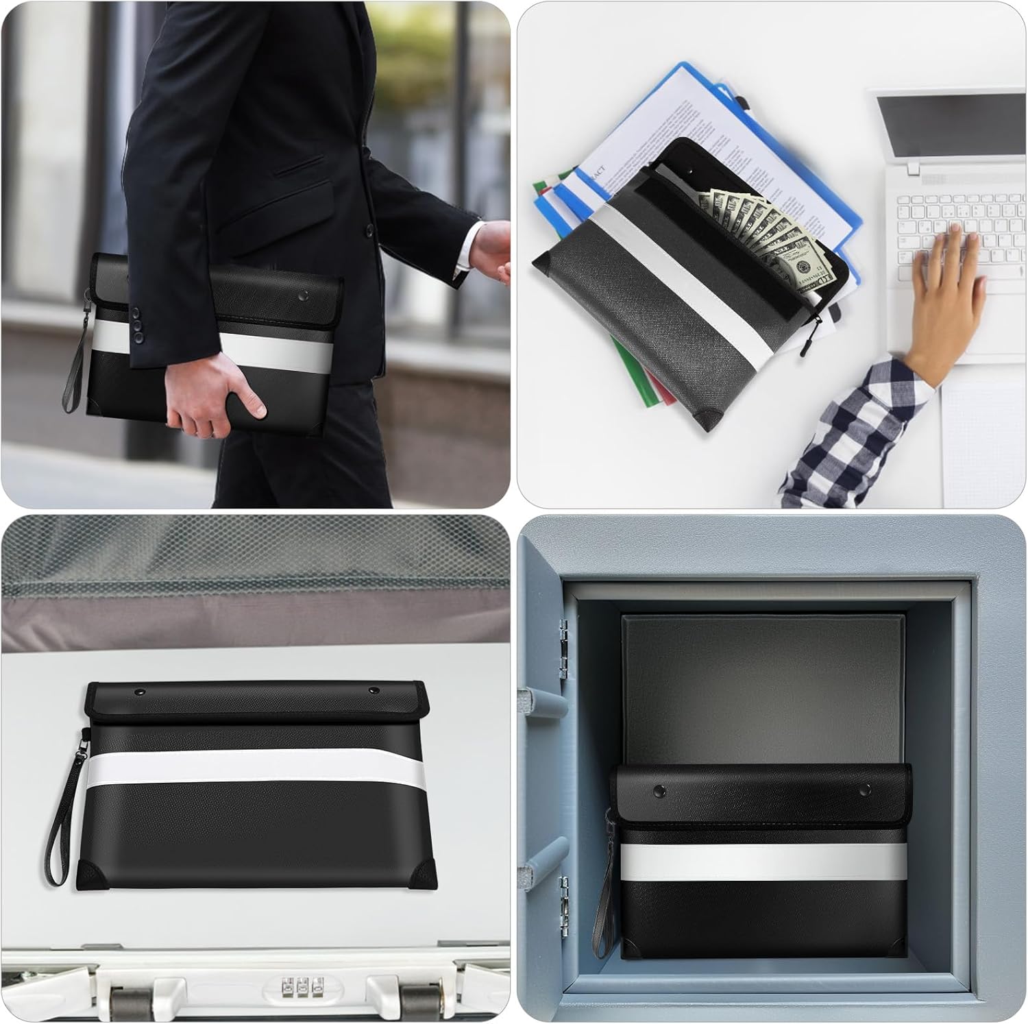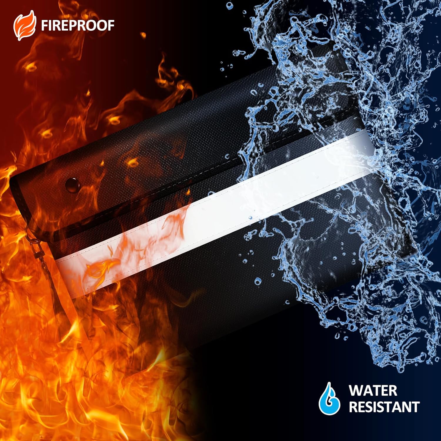 - ☔【Unique Design】This fireproof bag is not only functional but also stylish. It has a unique double-sided reflective strip that allows you to clearly see its position in the dark no matter how you place it. Its zipper is a treated waterproof zipper, combined with the Sticky buckle flip closure design, so that the fireproof bag can protect your documents under high-pressure water cannon, but note that it is not waterproof when submerged underwater.