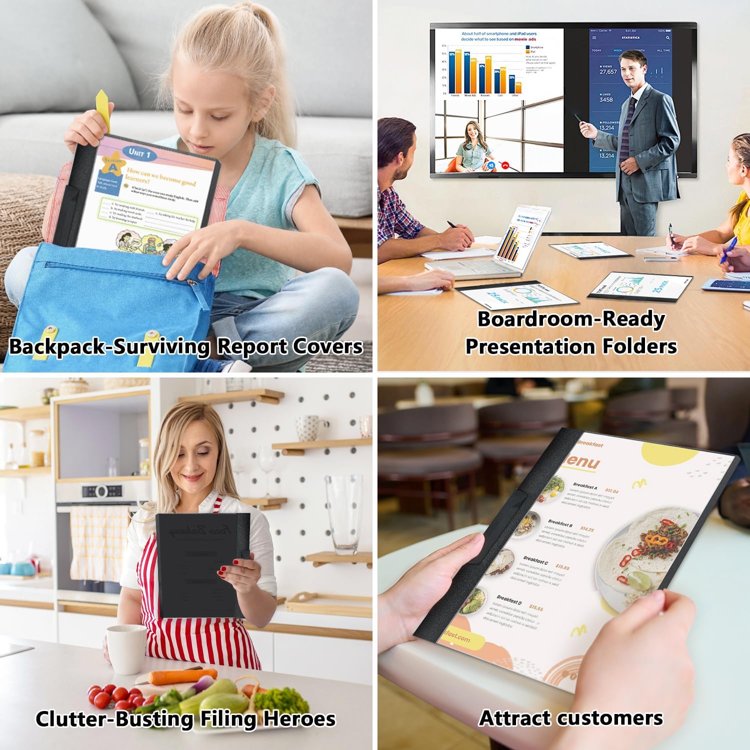 - Multi-purpose folder:Deployed in schools, corporate offices, medical facilities, homes, and retail spaces – these versatile folders streamline workflows by organizing reports for quick access, cut clutter as home filing heroes, and even shine as travel agency brochure holders or diner menu covers. One solution, infinite possibilities.