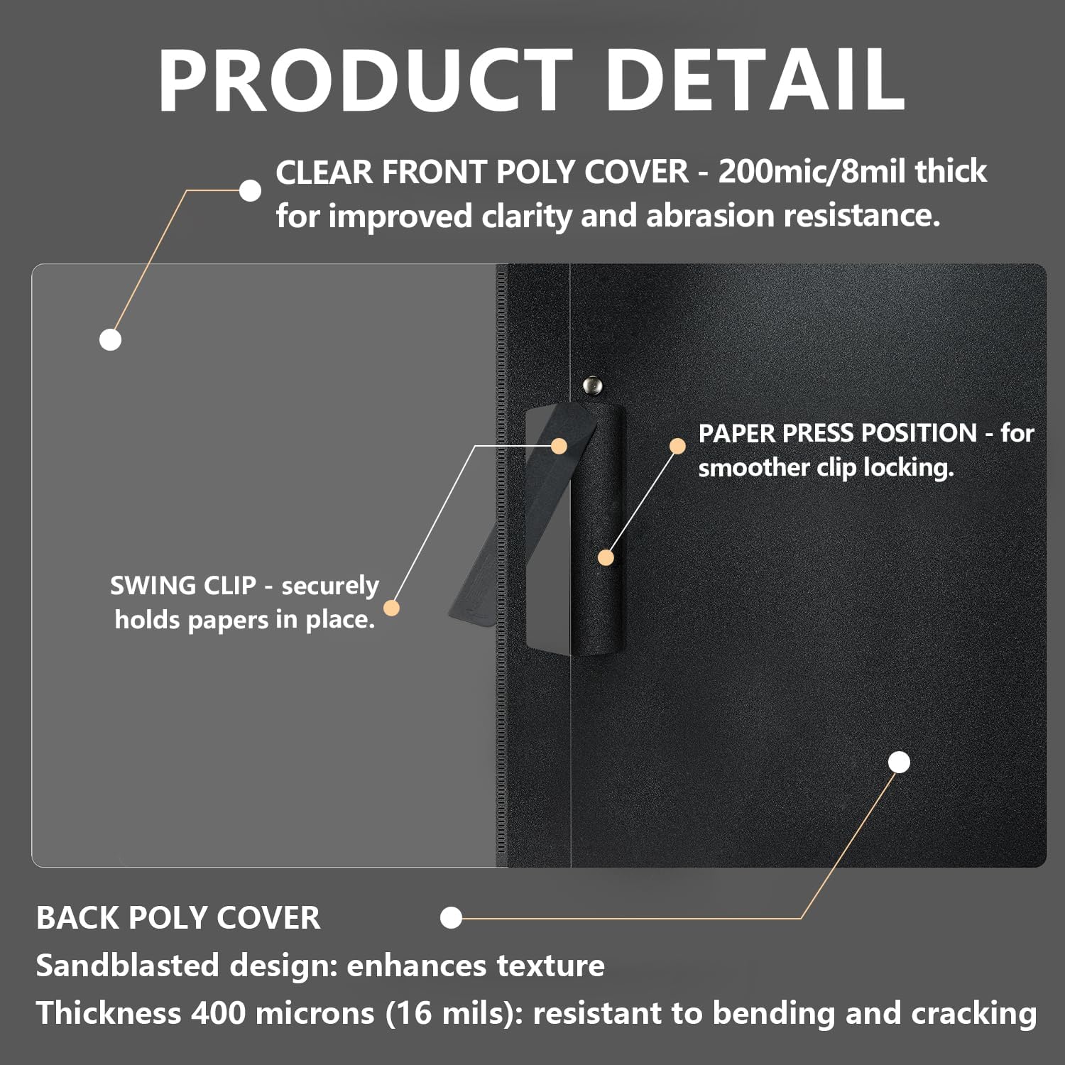 - Premium Clear & dent resistant folders: This file folder made with high-quality plastic. Crafted with 200-micron (8mil) optical-grade polypropylene front cover delivering crystal clarity – instantly reveal document titles for quick access. The 400-micron (16mil) reinforced back features a non-slip suede-textured finish that resists scratches, tears, and bending while providing protection.
