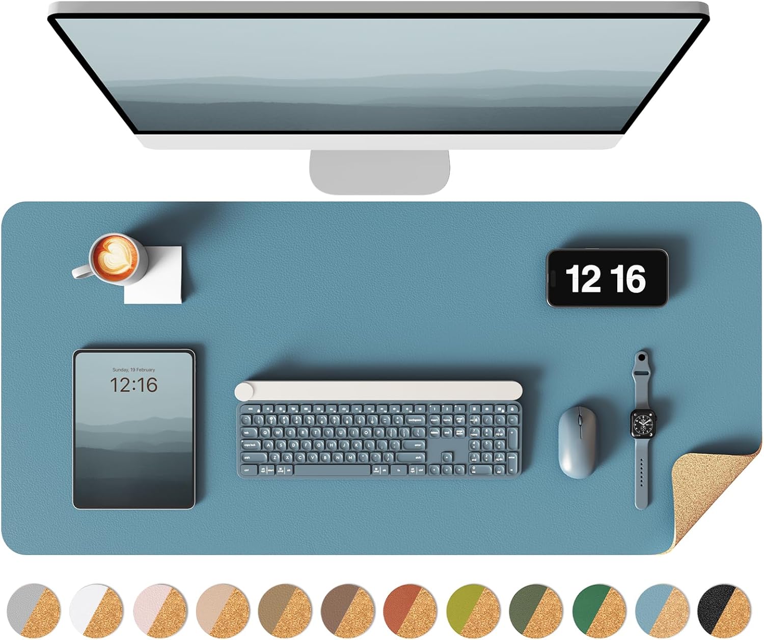 YSAGi Double-Sided Desk Pad, 31.5"x15.7"Leather Desk Mat, Eco Cork Desk Pad Protector,Large Mouse Pad,Waterproof Desk Blotter for Office/Home(Sea Blue)