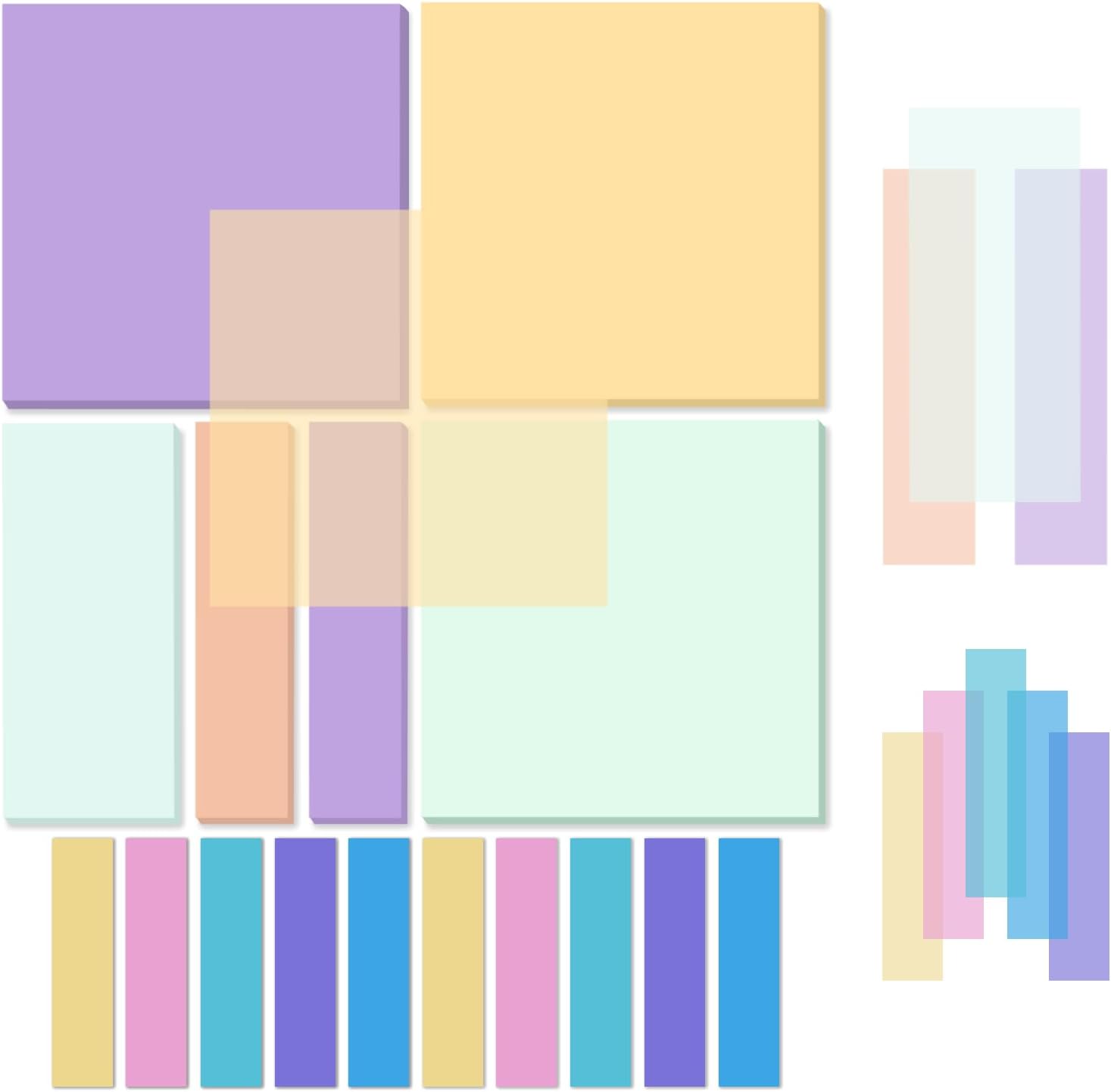 - What Will You Get: 150 Sheets transparent sticky notes( 3x3 inch ), 50 Sheets green translucent sticky notes(3x1.4inch), 50 Sheets pink translucent sticky notes(3x0.63 inch),50 Sheets purple translucent sticky notes(3x0.63 inch), 200 Sheets different colors book tabs(1.96x0.43 inch), sufficient in quantity, enough to be used for a long time,Translucent sticky notes meet your various note-taking needs.