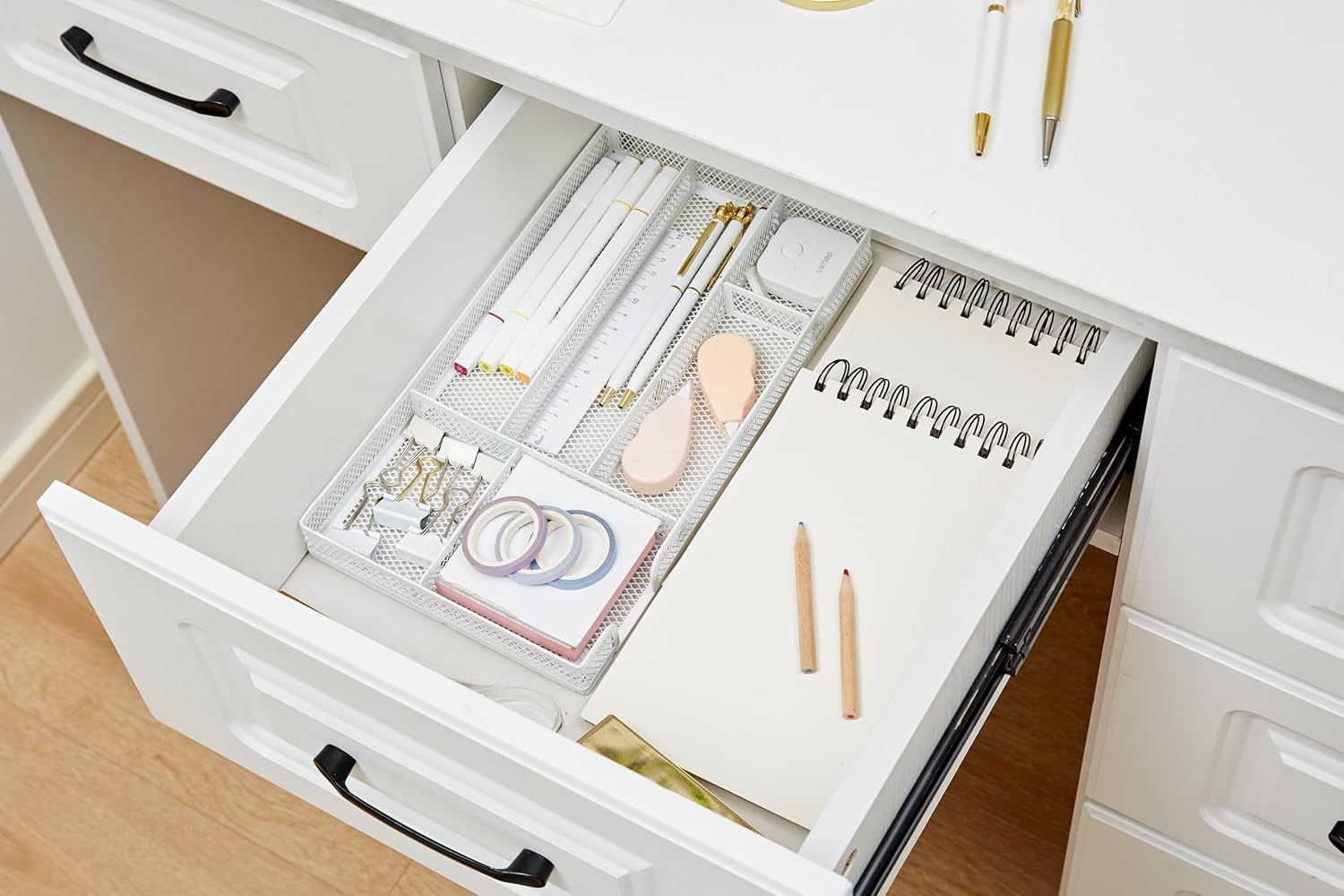 Annova Desk Drawer Organizer Tray for Office Organization - Metal Mesh - Storage Tray with Dividers for Pens, Desktop Accessories, Bathroom, Kitchen, Makeup and Office Supplies (Small, White)