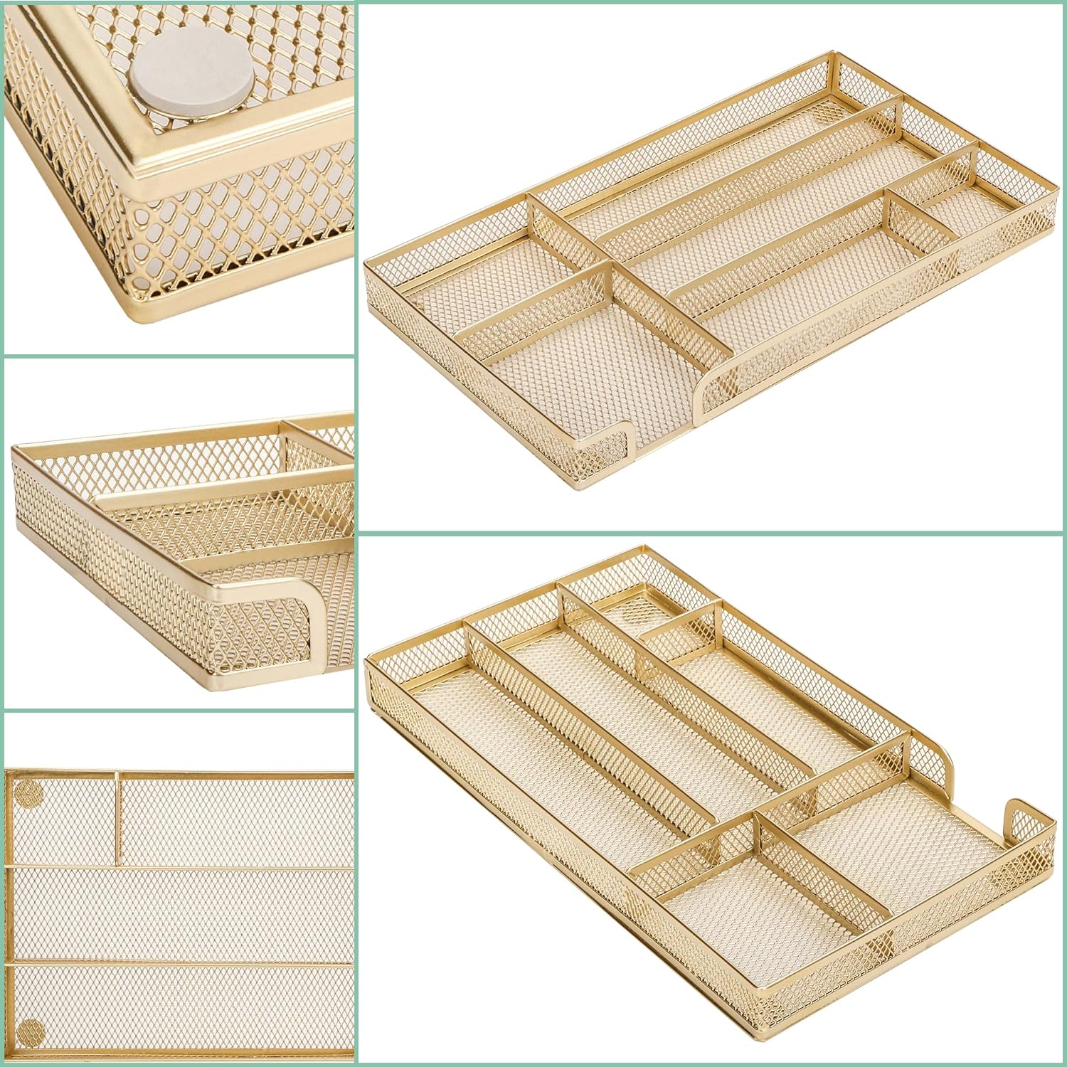 Annova Desk Drawer Organizer Tray for Office Organization - Metal Mesh - Storage Tray with Dividers for Pens, Desktop Accessories, Bathroom, Kitchen, Makeup and Office Supplies (Small, Gold)