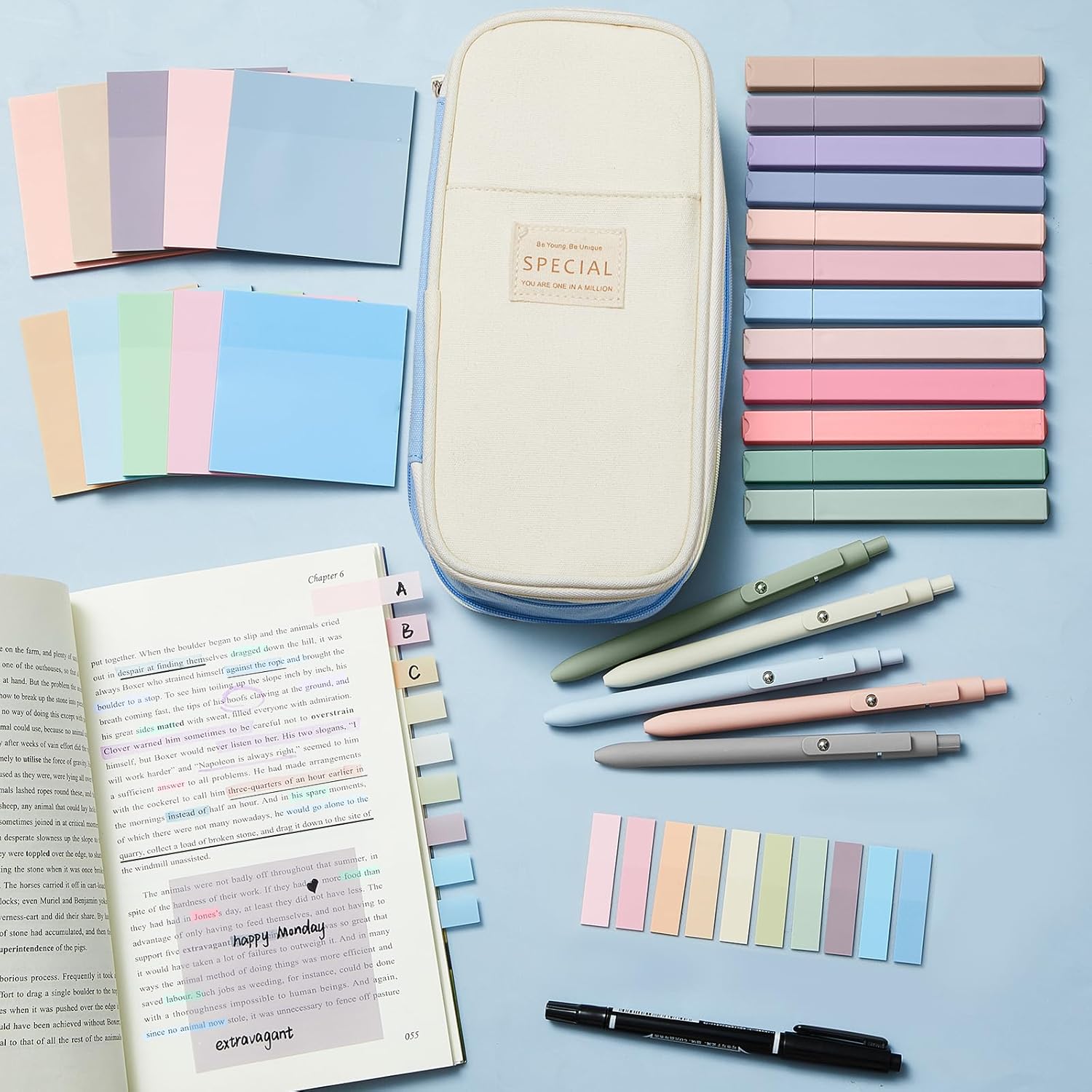 - Daily Use: aesthetic school supplies are suitable for everyday use, including 12 highlighters, 5 ballpoint pens, diverse colors, 1 light blue pen case, 1 marker pen, 10 pads of square sticky notes (500 sheets), 1 pad of sticky index tabs (200 sheets), gratifying your daily use and replacement demands for journal, notepad, work, study notes, bible study available for family, office, travel and so on