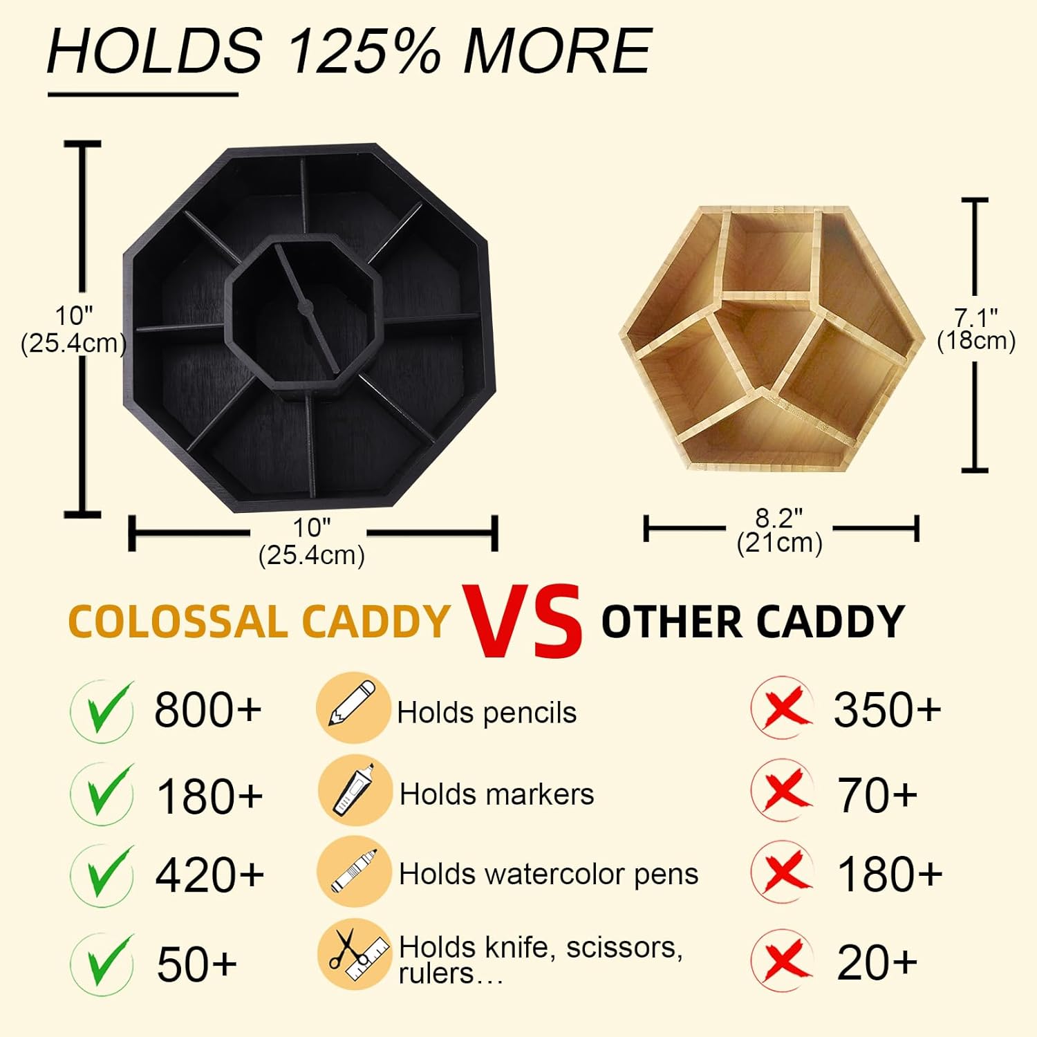 - DOUBLE CAPACITY - Our 10”x 10” extra large organizer holds 800+ pencils while others only holds 350. If you have more than 80 markers, go ahead and get one from us, or you need to pay twice for the small ones and they will take too much space of your desk because one small pen holder can't hold 80 markers. You can put all your art supplies on this XXL size storage desktop organizer. Also a good choice to hold your makeup and brush.