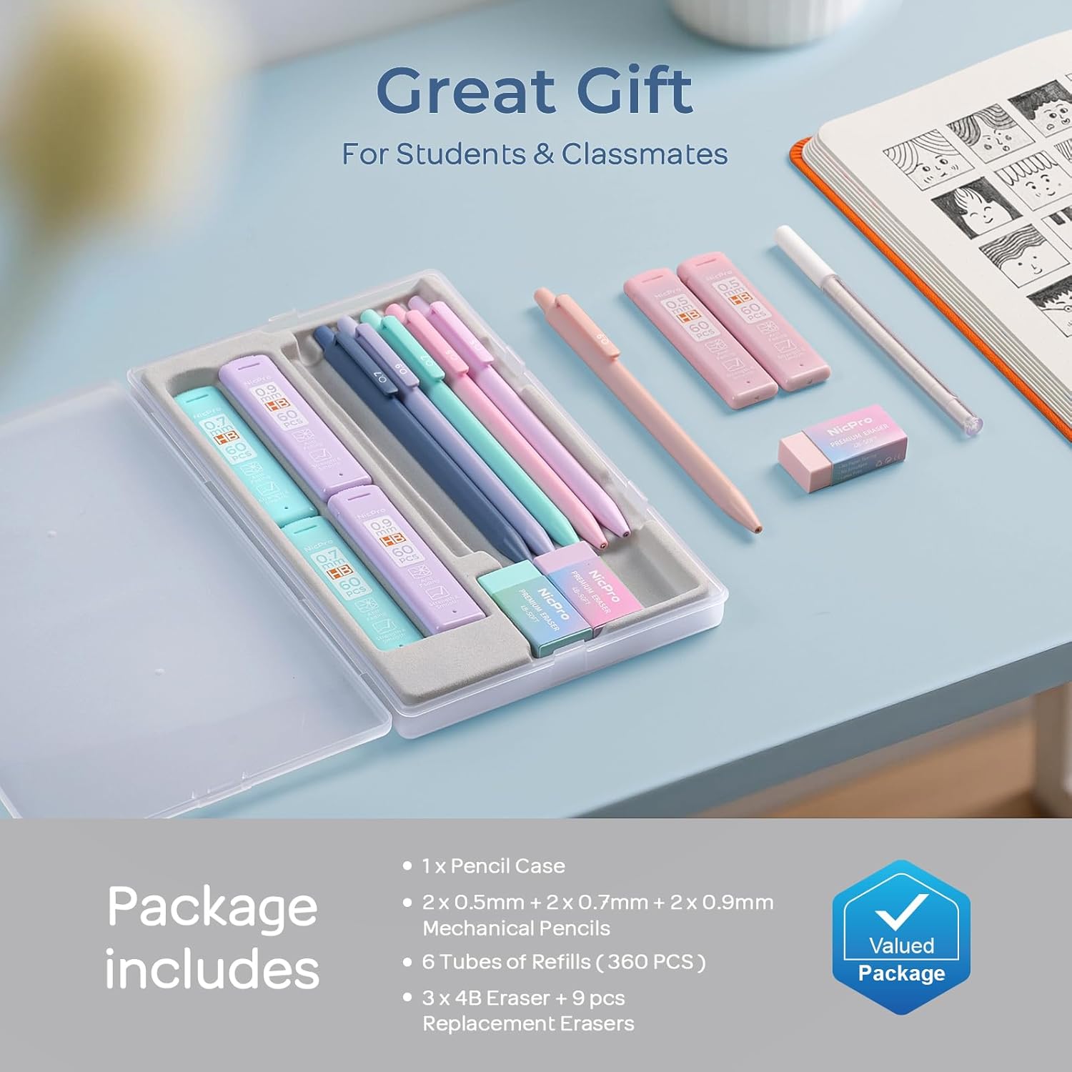 - Valued Mechanical Pencil Set: You will get a aesthetic mechanical pencil set, including 2pcs 0.5mm, 2pcs 0.7mm, 2pcs 0.9mm mechanical pencils 0.9mm, 6 tubes of lead refill in 0.5, 0.7 & 0.9 mm, 3 pcs pastel 4B erasers, 9pcs eraser refill, all in a storage case for easy storage and portability