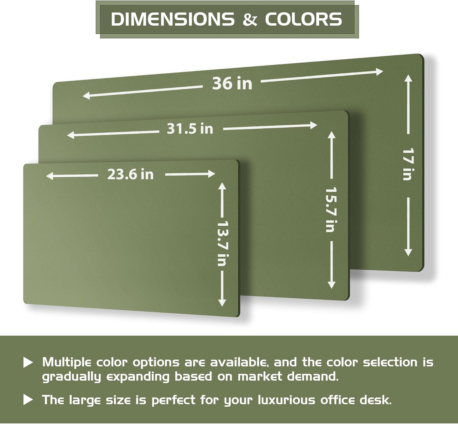 - Variety of Colors and Sizes: Available in a range of colors and sizes, our desk pad can seamlessly blend into diverse office and home environments, catering to individual needs and preferences. Size of 25.6"x13.7", 35.4"x15.7", 37.8"x17", thickness 0.08 inches, thick enough to provide soft and elastic touching; large enough to accommodate your laptop, mouse, keyboard and journal