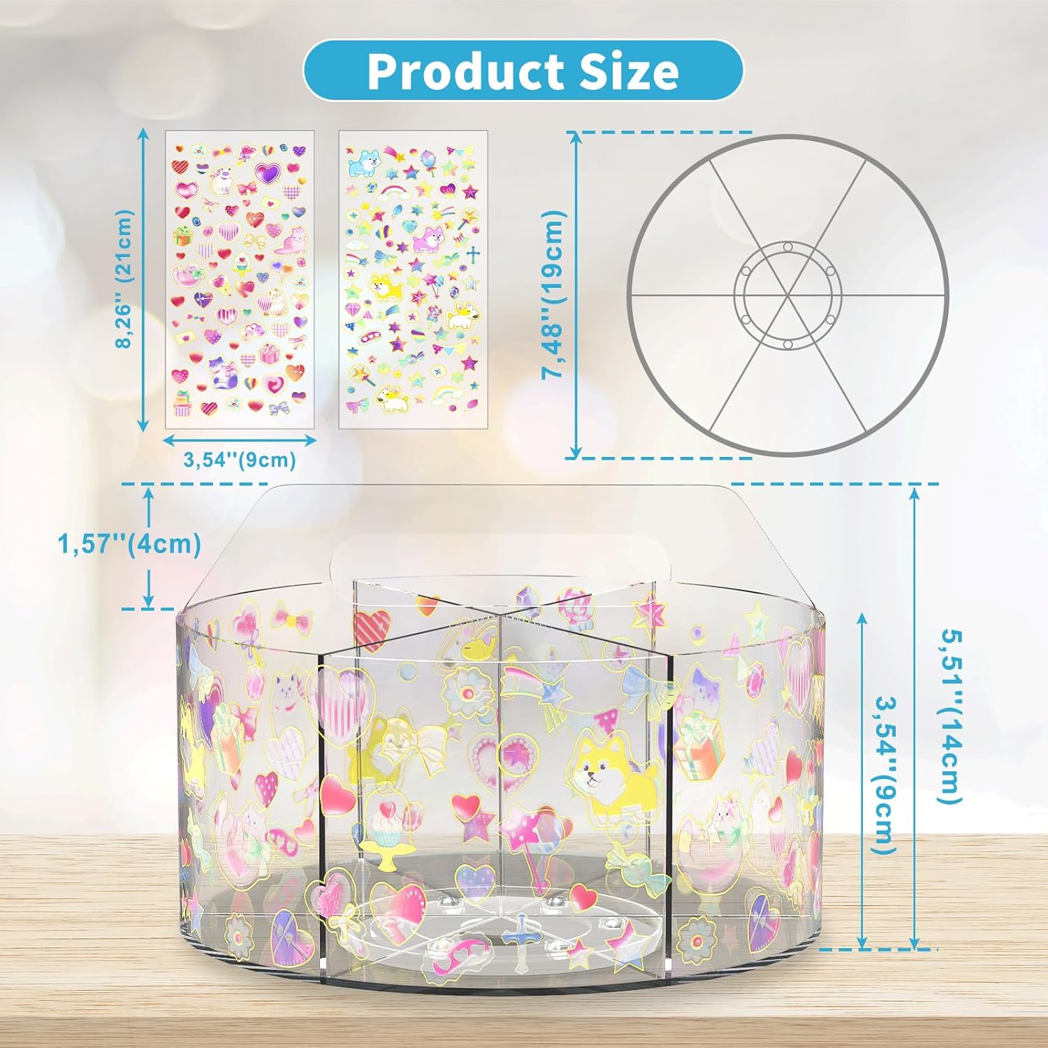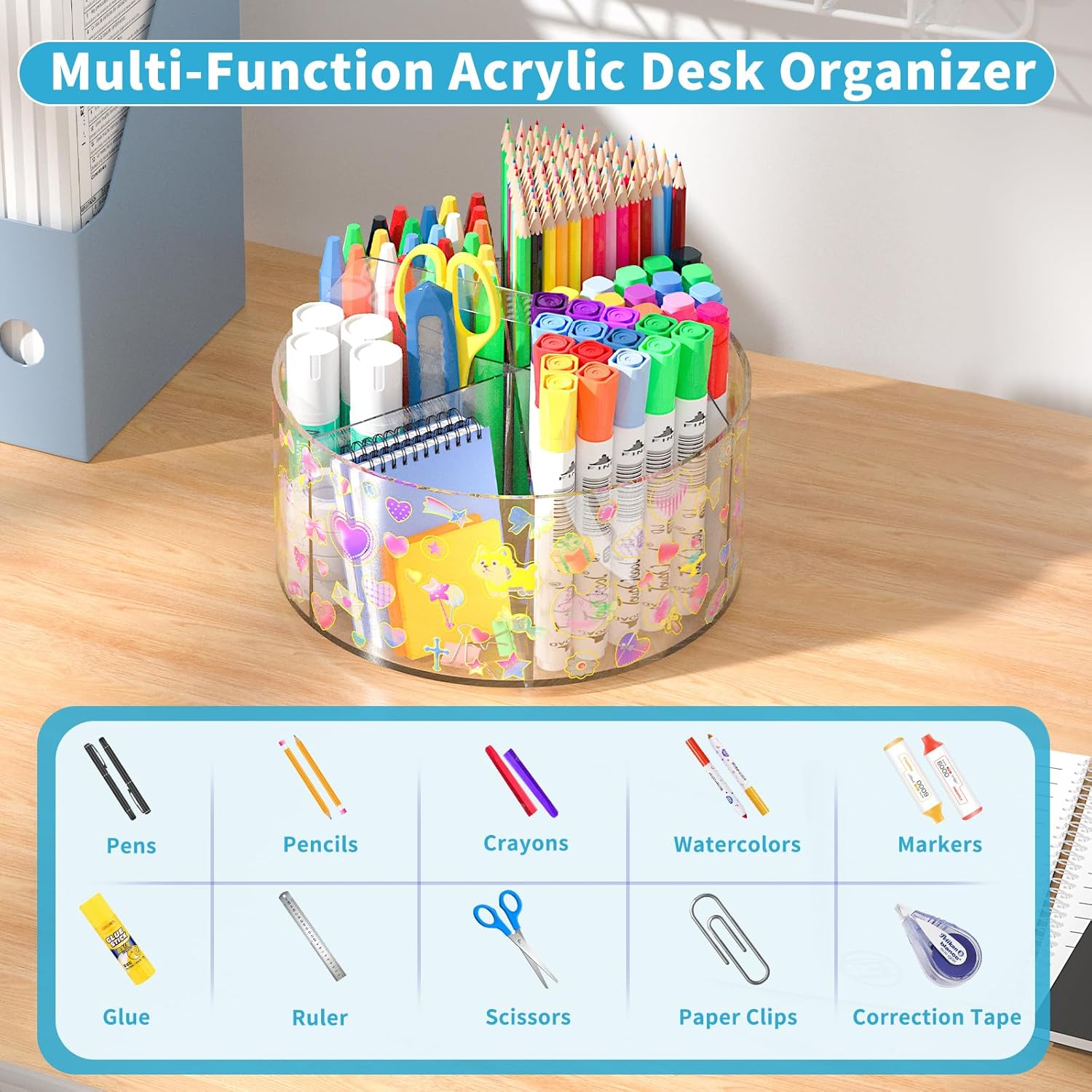 - Acrylic Spinning Desk Organizer Cute with Small Stickers Material: Wawocs 360 degree turntable acrylic pencil organizer for desk is made of 0,08 inch acrylic material, which is very sturdy and drop-resistant, odorless, tasteless, heat-resistant, and flame-retardant, highly transparent acrylic panels allow the contents of the turntable acrylic desk organizer to be seen at a glance, you can also to make it more your own style with mini stickers.