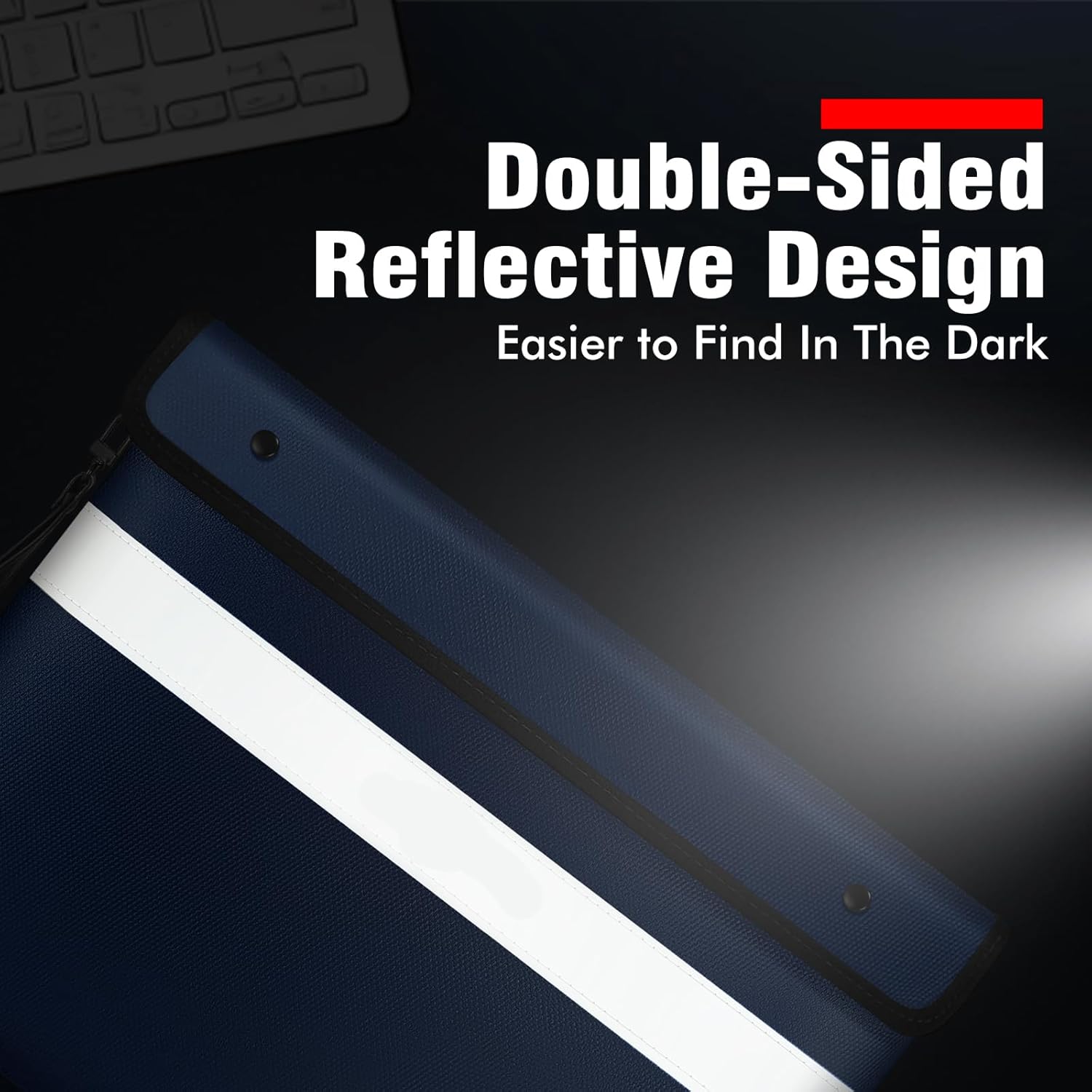 - ☔【Unique Design】This fireproof bag is not only functional but also stylish. It has a unique double-sided reflective strip that allows you to clearly see its position in the dark no matter how you place it. Its zipper is a treated waterproof zipper, combined with the Sticky buckle flip closure design, so that the fireproof bag can protect your documents under high-pressure water cannon, but note that it is not waterproof when submerged underwater.