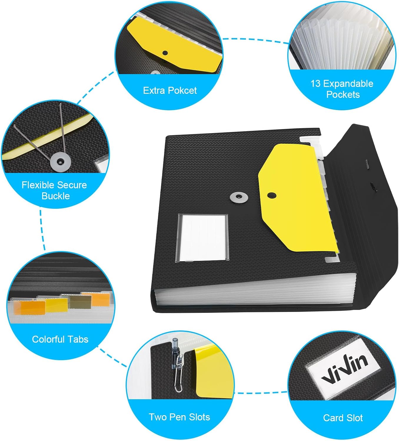 ViVin Expanding File Organizer, 13-Pocket Accordion Filing Folders with Extra Pocket & Color Tabs, Sturdy Expandable Ducument Organizer for Receipt Bills Invoice, Letter/A4 Size - Black