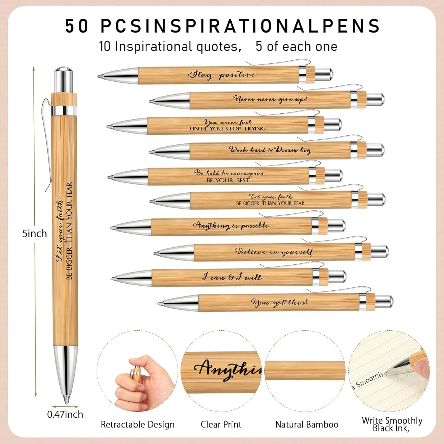 - Appreciation Gifts Bulk: you will receive 50 pcs of motivational spiral notebooks in 10 designs, 5 pcs for each design, each equipped with sticky notes and index tabs, and 50 pcs of retractable bamboo pens in 10 designs, 5 pcs for each design, enough quantity to satisfy your daily use and sharing needs