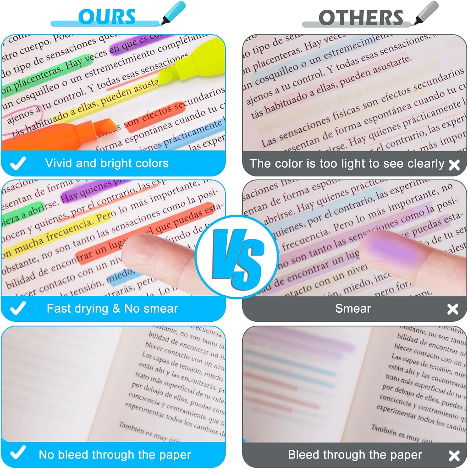 - Non Bleed & Quick-Drying Highlighter - Highlighter pens use quick-drying ink, making highlighted marks clearly visible without worrying about the ink staining your hands and your book. Even if you highlight on one side of the page, the other side is still completely readable, and there's no need to worry about ink bleeding through and affecting the readability of the page.