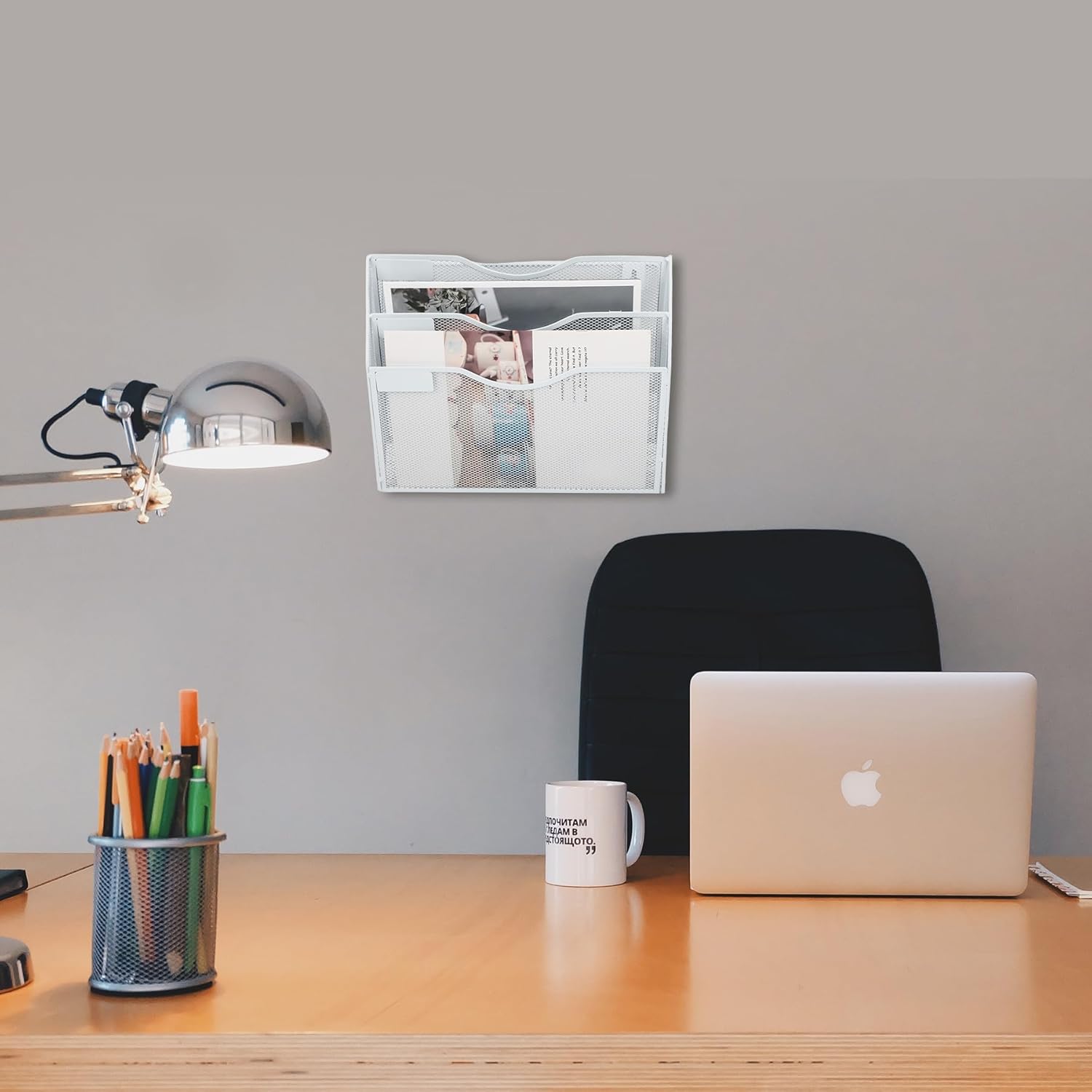 EASEPRES 3 Pocket Mesh Hanging Wall File Organizer, Wall Mounted Mail Paper Document Folder Holder, Clipboard Storage Organization Magazine Rack with Nametag Label for Office Home School, White