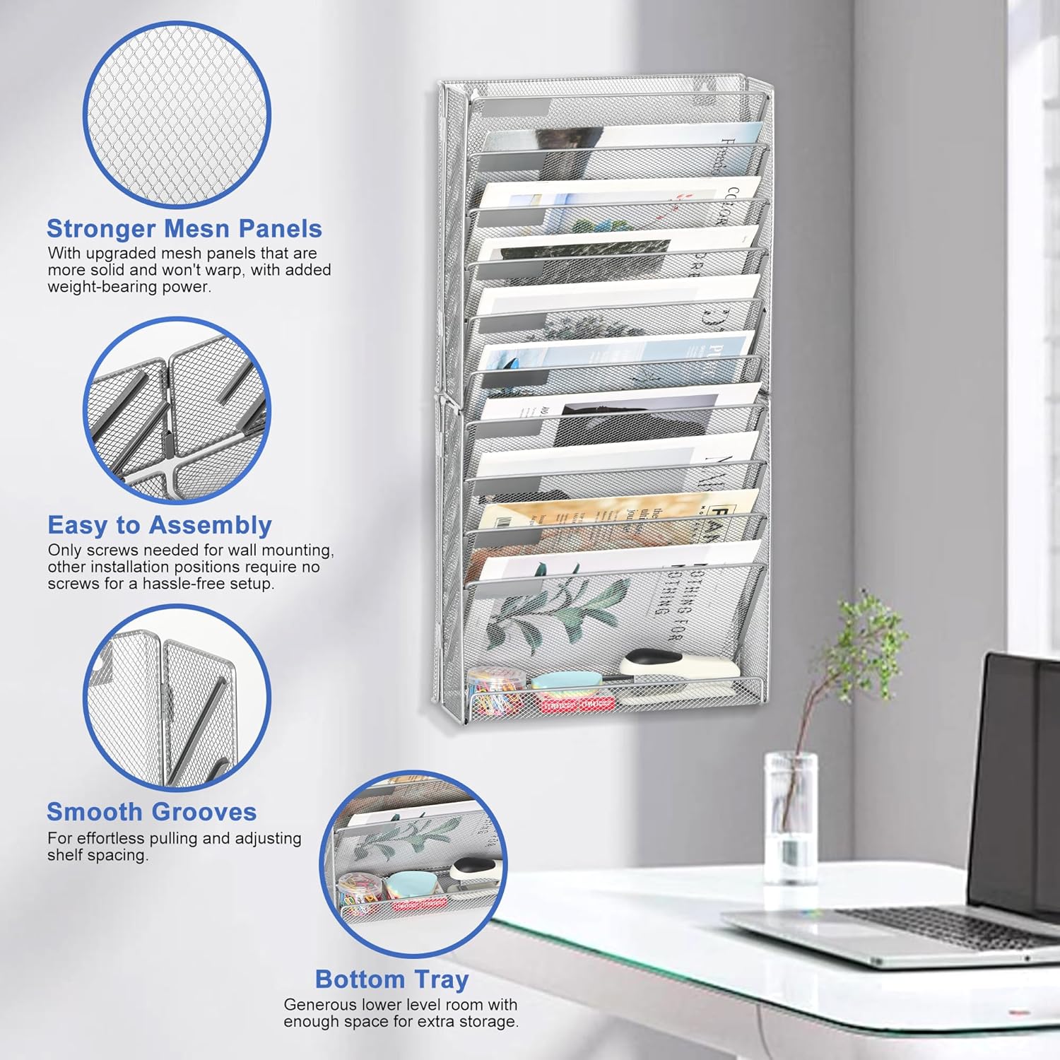 EasyPAG 11 Tier Wall File Holder with Flat Tray, Silver | Easy Assemble Mesh Desk File Organizer | 10-Folder Paper Storage | Replaceable Classify Labels | Space Saving Mail Organizer for Office Home