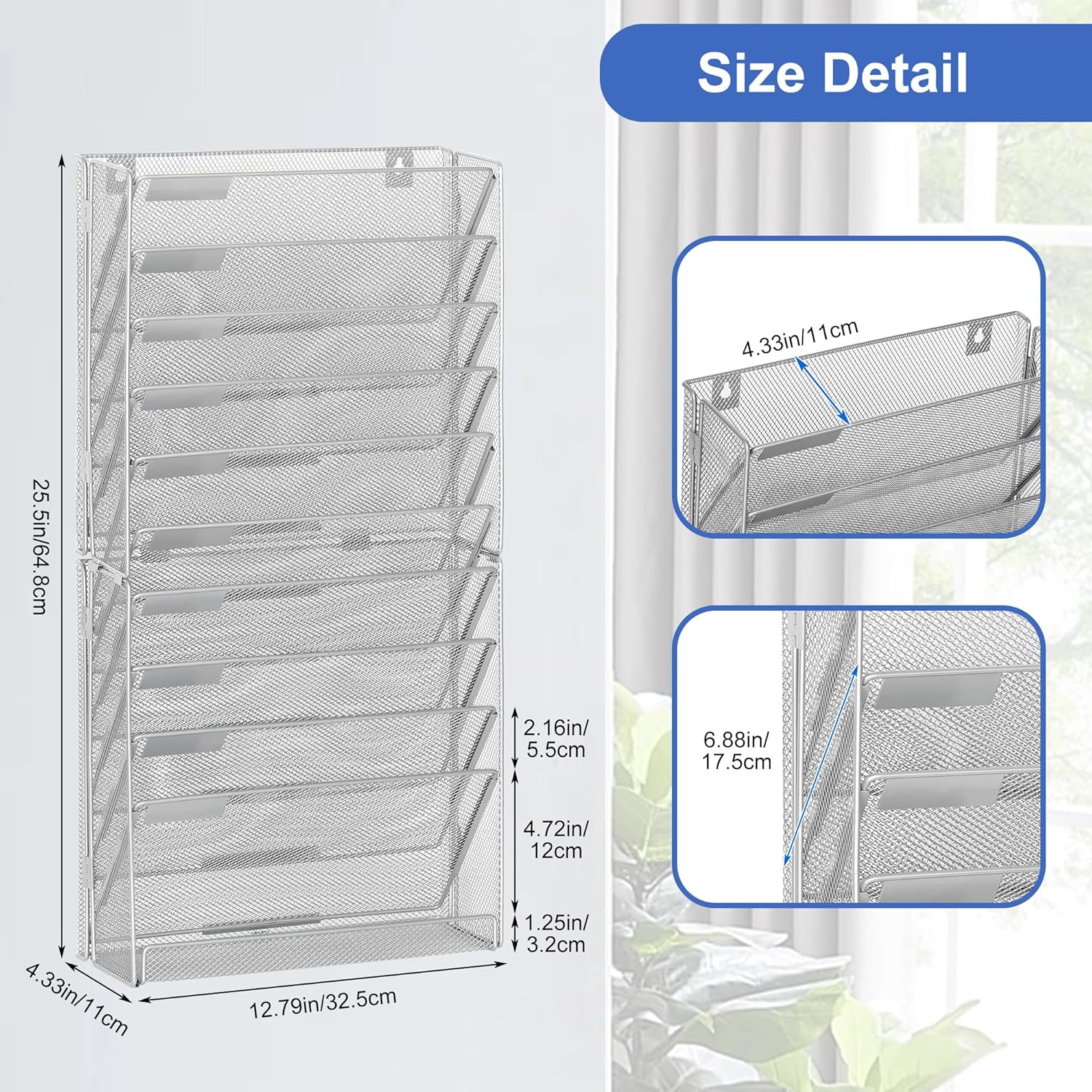 - 10+1 Tier Oversized Capacity: Wall mounted file organizer with 11 pockets stores 10 folders + accessories. Flat tray holds mail, bills, magazines. Includes white labels for instant office/home categorization.