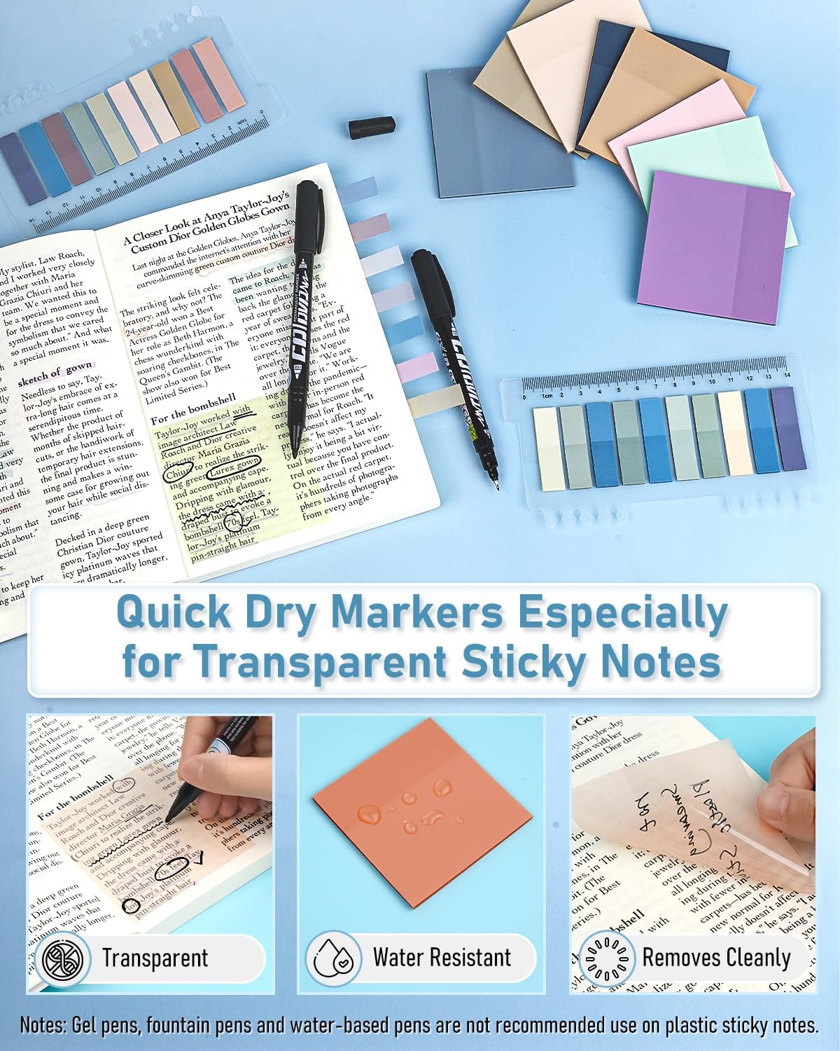 - Annotation kit: Including 12 colors clear sticky notes and 30 colors index labels, along with 2 dual ended quick dry markers, ensuring your notes clear and not smearing. The sticky notes pads and index tabs adopt quality PET material, waterproof, durable, and will not leave any residue on the page, you can be written on the information and paste it wherever you want