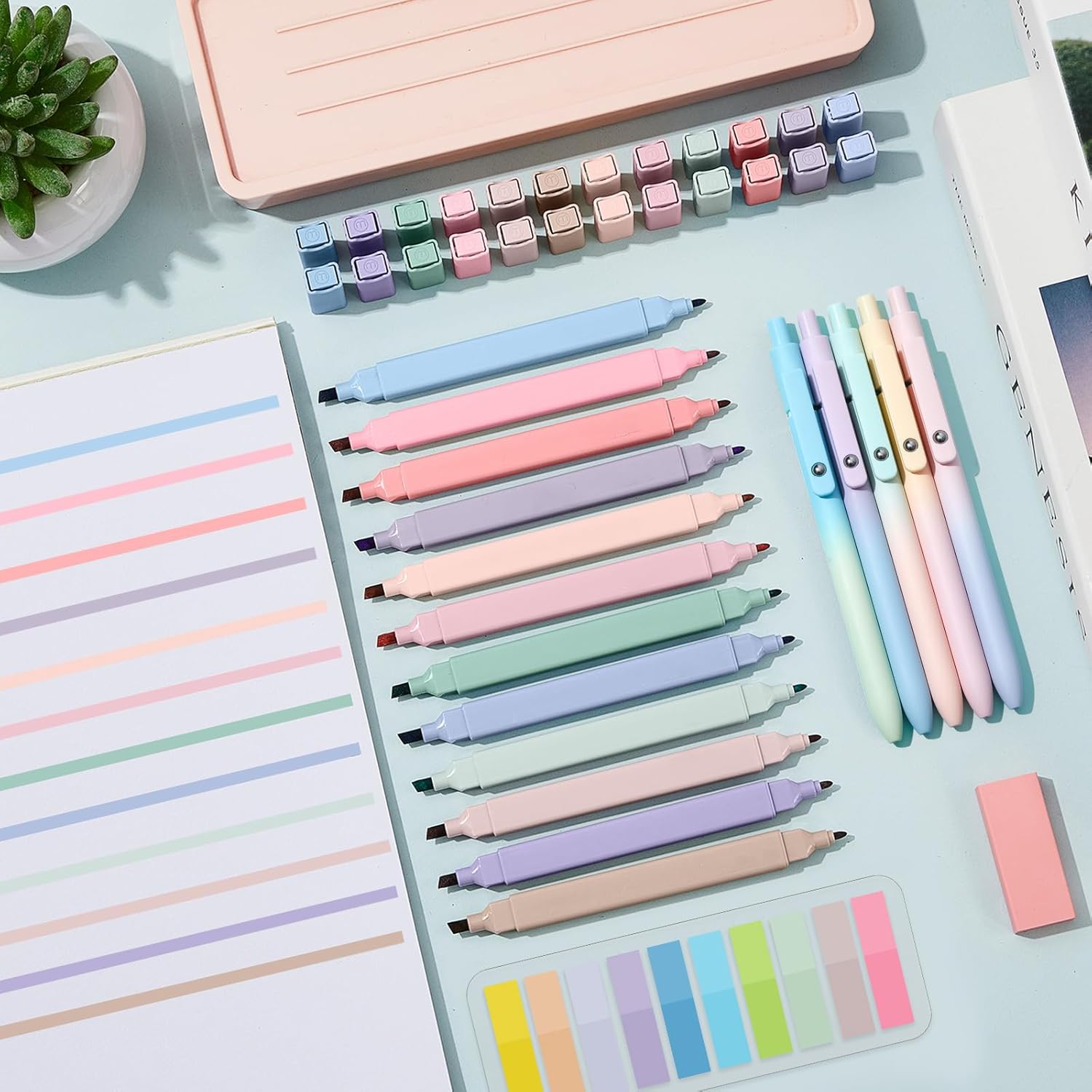 Jutom 38 Pcs Book Annotation Kit Aesthetic Highlighters Gel Pens Set Sticky Notes Tabs Markers Dual Ended Highlighter Quick Dry Ink Pens for Office Annotating Books(Gradient Color,Square)