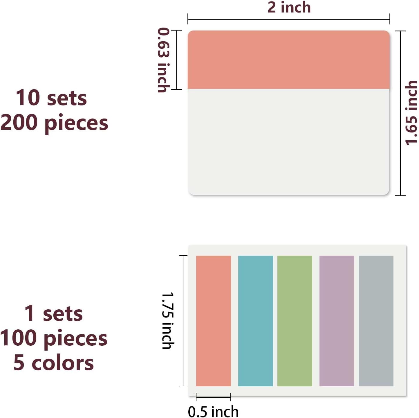 - 300pcs Book Tabs: 300 pcs 21 sets in total, 200 pieces 2 inch sticky tabs in 10 sets with different pastle colors,100 pieces 0.5 in tabs in 1sets, 20 pieces each color