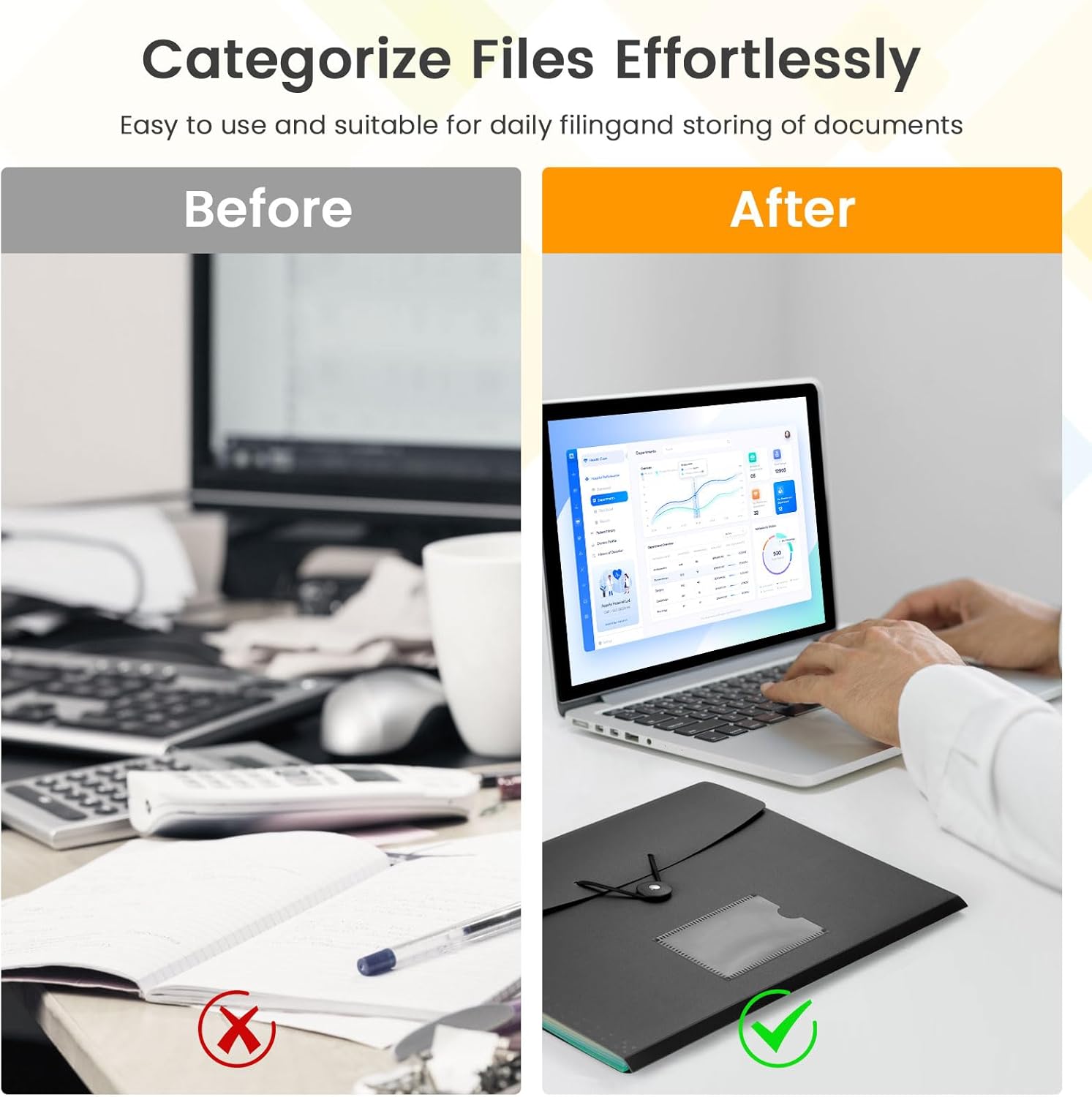 - VERSATILE USAGE: Ideal for storing utility bills, invoices, and more, it's perfect for school, work, or home use. Includes an extra pocket for business cards, enhancing convenience and organization. Stay organized effortlessly with our premium file organizer