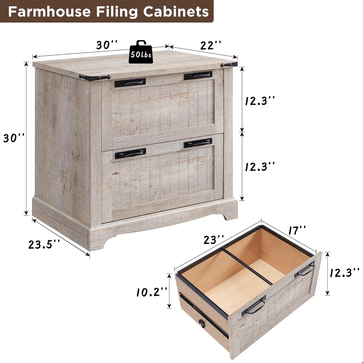 - Sturdy Construction: The filing cabinets are produced from high-quality engineered wood and are built to endure daily application and provide lasting storage. Designed with the customer in the forefront of the mind, this 2-drawer farmhouse file cabinet combines functionality and aesthetics. Tabletop can hold up to 50lbs.
