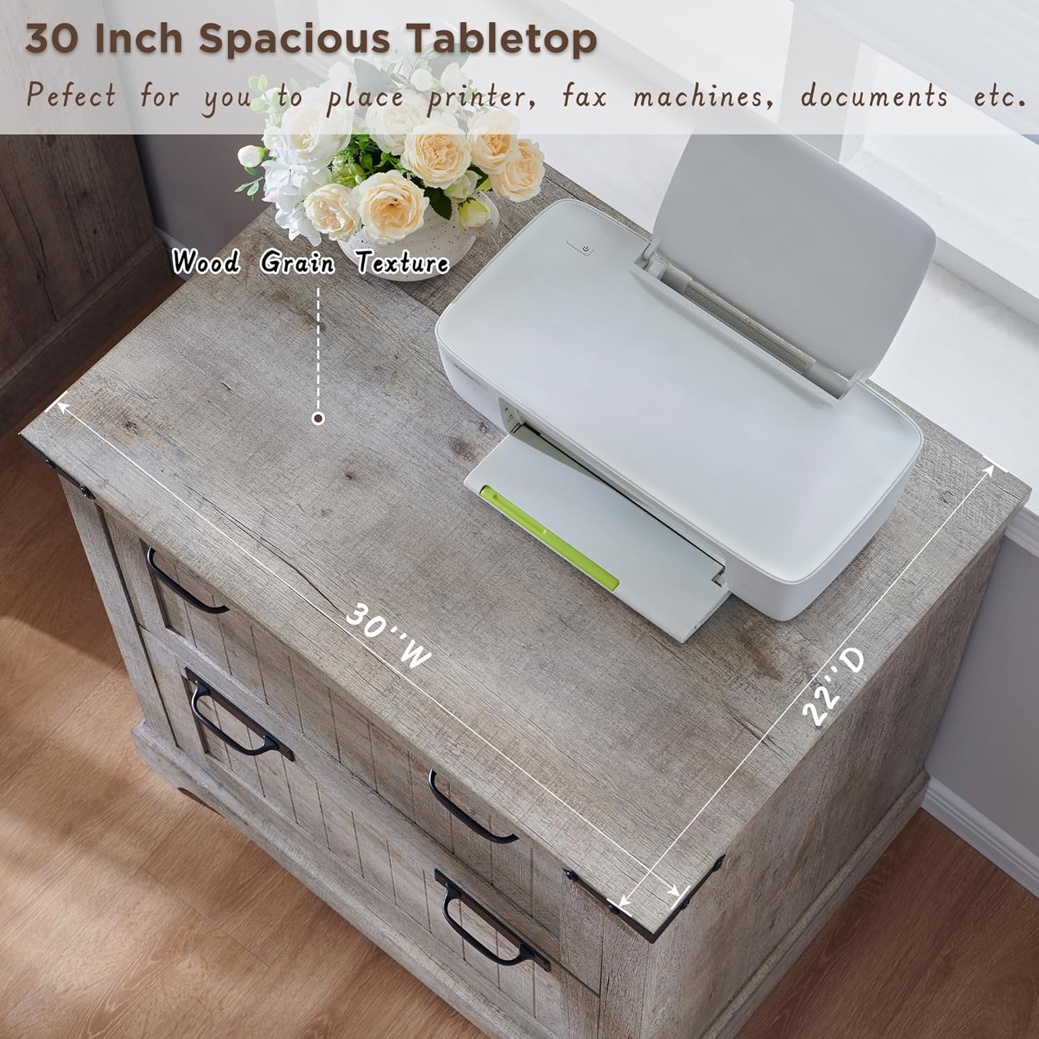 - 30 Inch Spacious Desktop:This office filing cabinet is a powerful assistant for your efficient work. 30 inches spacious desktop has a rustic finish with a delicate touch, being stain-resistant and easy to clean. No matter if you use it intensively for a long time or accidentally cause bumps or water spills, it will always remain aesthetically pleasing and practical.