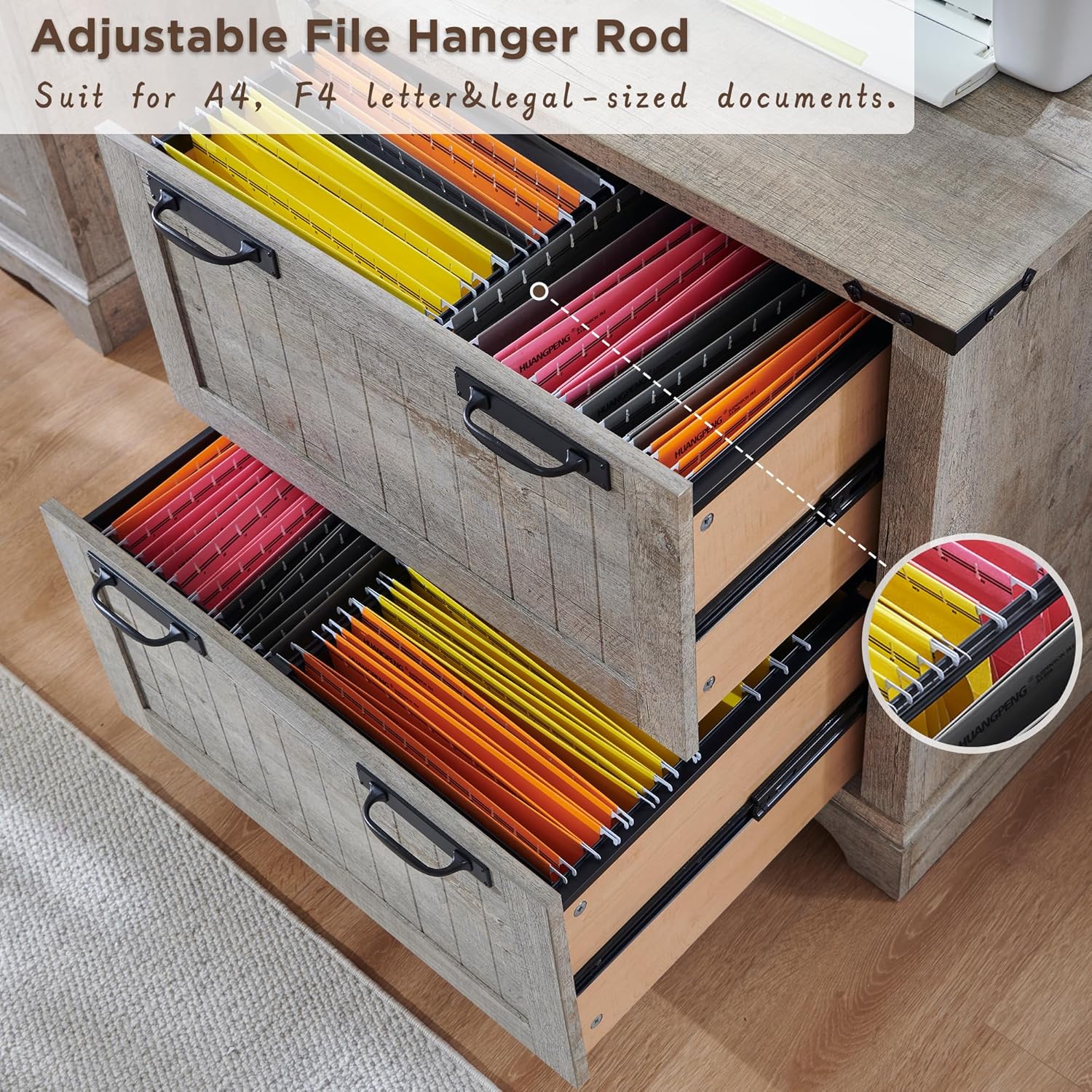 - Large Capacity Storage: Feature with 2 large drawers and possesses a vast interior space, which can effortlessly accommodate a large number of files, folders, and various office supplies. The file hanger rod design and reasonable zoning facilitate the classified storage of different types of files and improve the storage efficiency.