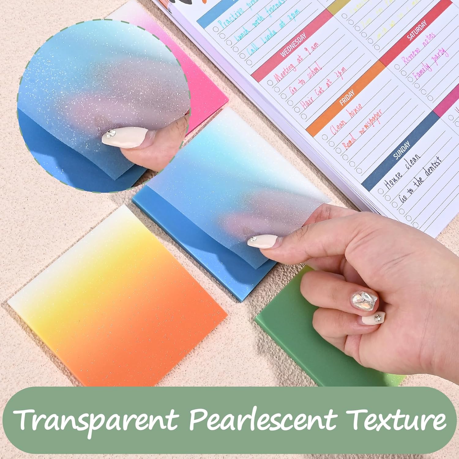 - Portable Size: Glitter Translucent self-adhesive sticky notes measures 3 x 3 inch (200 sheets), sufficient in quantity, enough to be used for a long time, translucent sticky notes meet your various note-taking needs