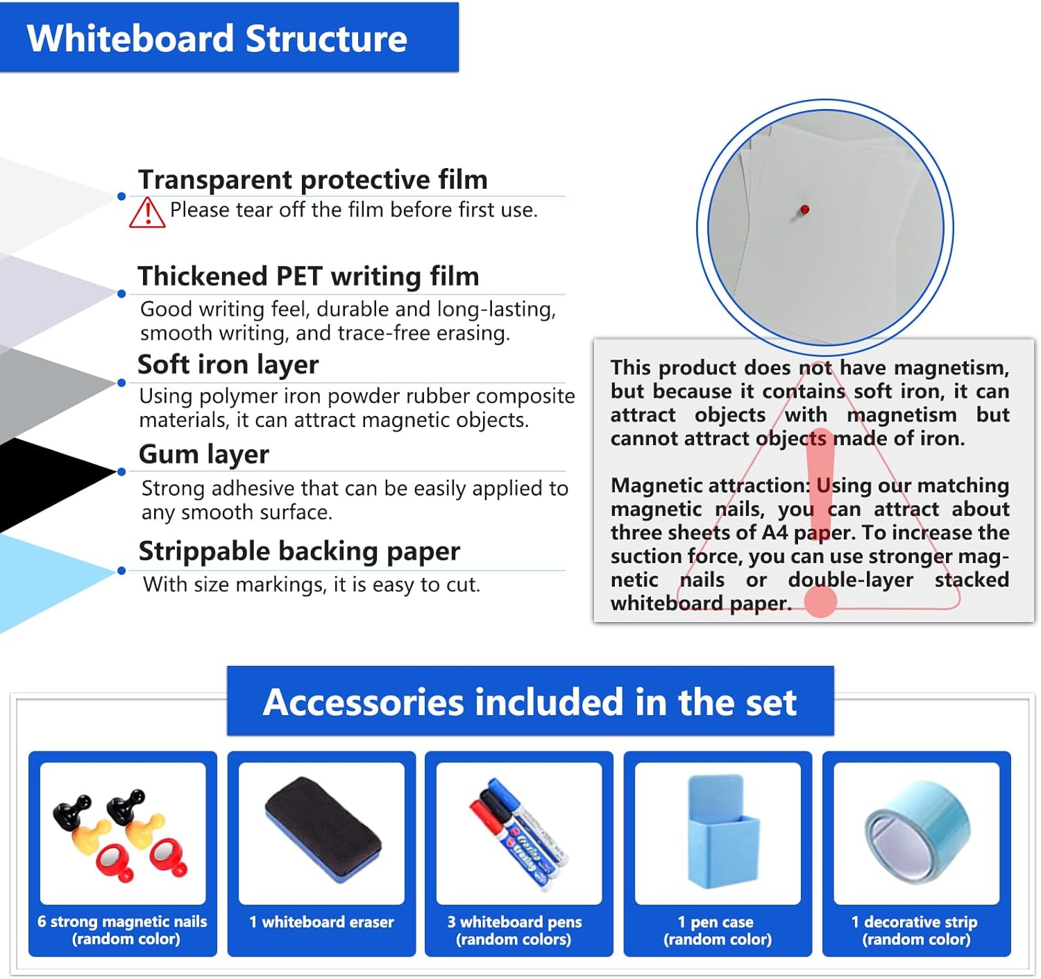 - SET INCLUDES: Magnetic whiteboard film, 6 magnetic pins, 3 whiteboard markers, 1 pen holder, 1 whiteboard eraser, and 1 decorative strip (note: the decorative strip is not adhesive tape for attaching the whiteboard for dry erase). Ready to use upon delivery—no need to purchase additional accessories. NOTE: The magnetic dry-erase board wallpaper itself does not have magnetic properties, as it contains soft iron. It can attract magnetic objects, but it cannot attract steel or non-magnetic objects.