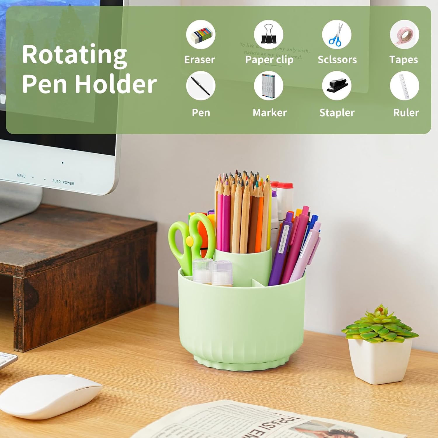 - ăMultipurpose Desktop Organizeră: This rotating storage organizer is perfect for pencils, cosmetics, bathroom necessities, toiletries, and even kitchen utensils. Try it in your craft room, playroom, laundry/utility room, and even inside bathroom cabinets or under the sink; Store extra office supplies like painting pens, correction tape, scissors, TV Remote, and more; Even headphones or a charger will no longer be lying around in the future! Maximize your vertical space and keep your desk clear